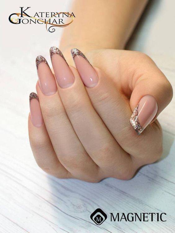 Часто используется как праздничный. Нюдовый прекрасен с серебром. Сегодня в моде эффект омбре, украшения. Серебристым можно подчёркивать декор лентами, использовать паутинки, надписи.