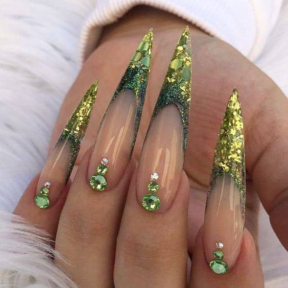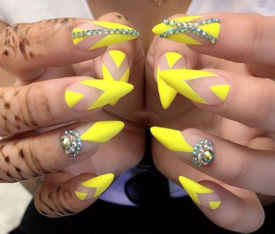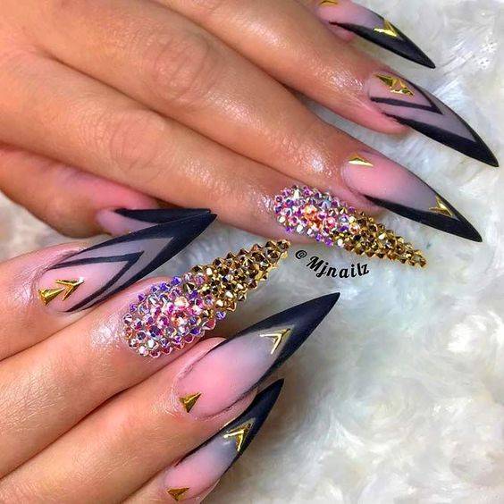Также могут использоваться мелкие стразы, размещенные на ногтевой пластине в виде россыпи, либо какого-либо рисунка. Также из блесток можно выкладывать различные геометрические узоры, по типу линий, ромбов, треугольников и прочего.