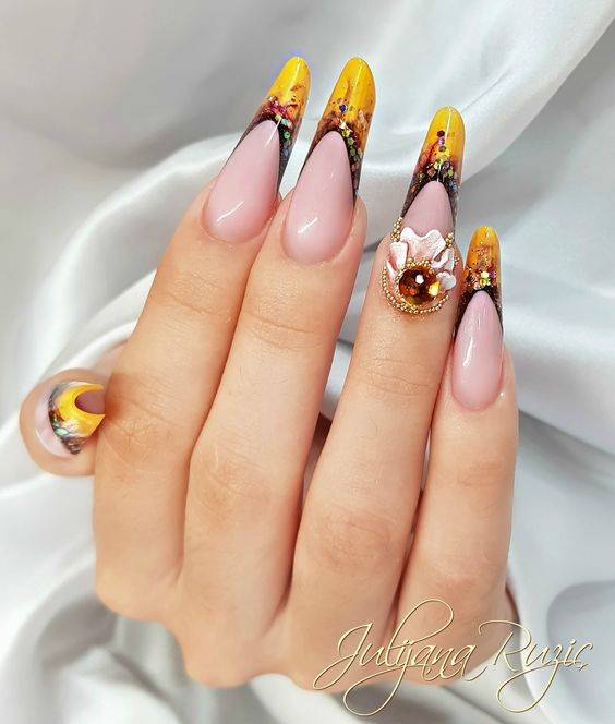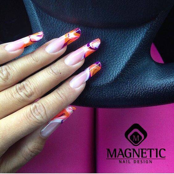 - Овальные ногти. На ногтях овальной формы хорошо выглядят арт-эксперименты с цветочными узорами, глиттером или втирками.