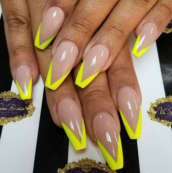 Для ее выполнения применяется ноготки значительной длины. Их срезают под градусом 45 градусов в любую сторону. Если для выполнения френча ноготок наращивается, тогда есть возможность сделать форму сложнее не только со скошенным, но еще и закругленным краешком.