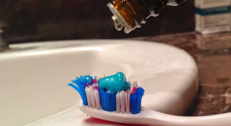 - Используют 2-3 капли масла, размещенного на зубную пасту, набранную на щетку во время обычной процедуры чистки зубов.