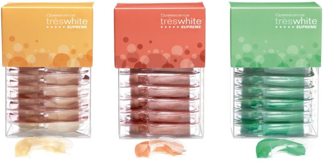 набор для домашнего отбеливания зубов TresWhite Supreme. Главным отличием данного домашнего набора является его практичность. Открыв упаковку, вы обнаружите 10 готовых кап для верхней и нижней челюсти, которые уже заполнены отбеливающим гелем на основе перекиси водорода. Капы изготовлены из очень тонкого материала, подходят к любой челюсти, её не нужно подгонять по размеру. Производители позаботились и о вкусовых ощущения человека, которые он будет испытывать во время отбеливания зубов. Вы можете выбрать для себя аромат ментола, арбуза или персика;