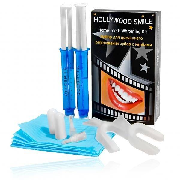 набор для домашнего осветления зубов Holywood Smile Home Celebrity. Производители уверяют в отличном результате после использования данного набора. Вы сможете за 2 недели добиться осветления зубов от 4 до 6 тонов. В набор входит 2 шприца со специальным гелем и 2 капы. Набор рекомендован к использованию людям, которые хотят поддержать эффект после профессионального отбеливания у стоматолога. Данные средства будут особенно эффективны и для тех, кто страдает изменением цвета эмали после курения, кофе и т.д.;