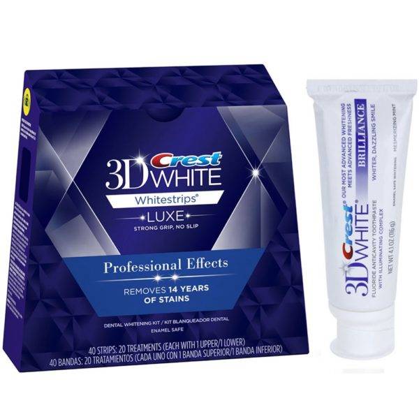набор для отбеливания зубов CREST 3D White. Набор состоит из специальных отбеливающих полосок, которые нужно наклеивать на зубы, и отбеливающей зубной пасты. Первые заметные результаты вы сможете увидеть уже через 3 дня, а через 3 недели ваша улыбка станет как после профессионального осветления у стоматолога. Производитель уверяет в том, что результат отбеливания зубов до 4 тонов сохранится на протяжении 1 года.
