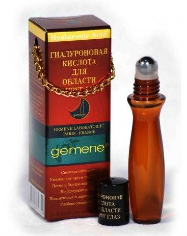 - Гиалуроновая кислота «gemene». Представляет собой жидкое средство в небольшом флаконе со специальным роликом для удобства нанесения. Применять его следует дважды в день (можно и чаще при необходимости) самостоятельно или в комбинации с омолаживающим или восстанавливающим кремом. Для усиления эффекта препарат хранят в холодильнике. Согласно рекомендациям опытных пользовательниц, тогда он лучше убирает темные круги и отеки. Увлажнение ощущается сразу же, результат заметен после 3-недельного курса.