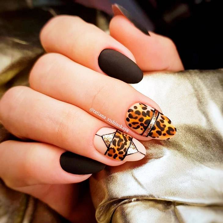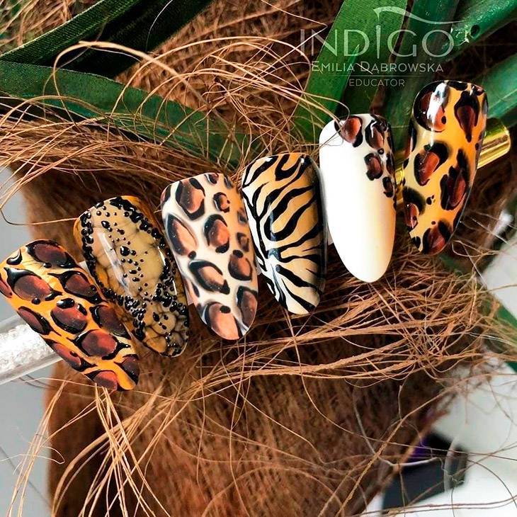 Несомненно, тигровый принт ушел из модной одежды, но пришел к овальным ногтям. Здесь ситуация неожиданная: не только оранжевый будет выгодно смотреться, но и акценты расставляют иначе. Так, мастера рекомендуют оставлять однотонным только один ноготь, а тигровые полоски рисовать на всех остальных.