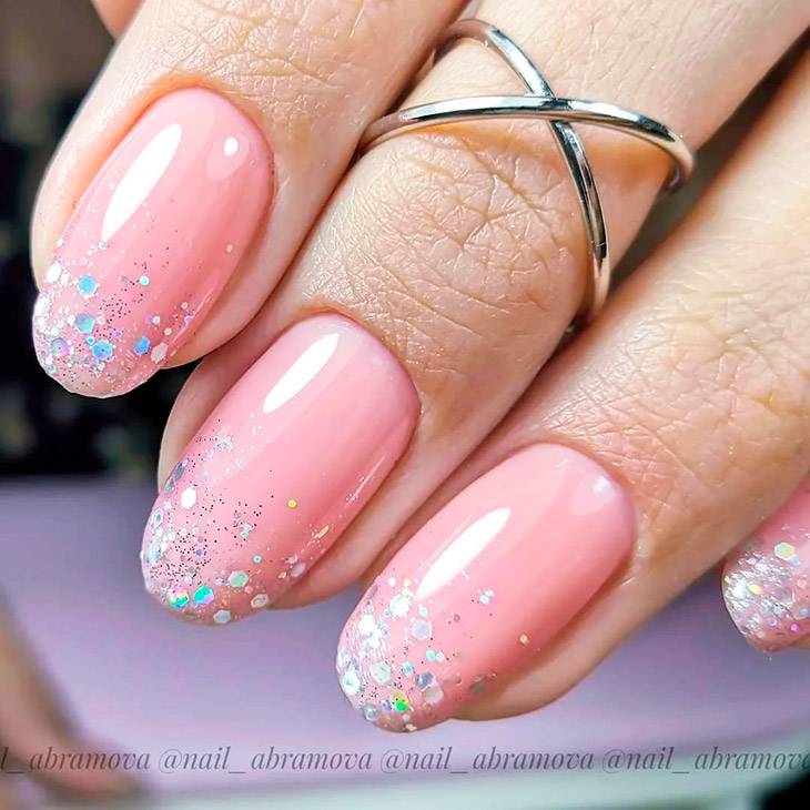 Овальный маникюр с присыпкой будет хорошо сочетаться с любым цветом, поскольку это декорирование. Однако не стоит «засыпать» все ногти, расставляйте акценты.