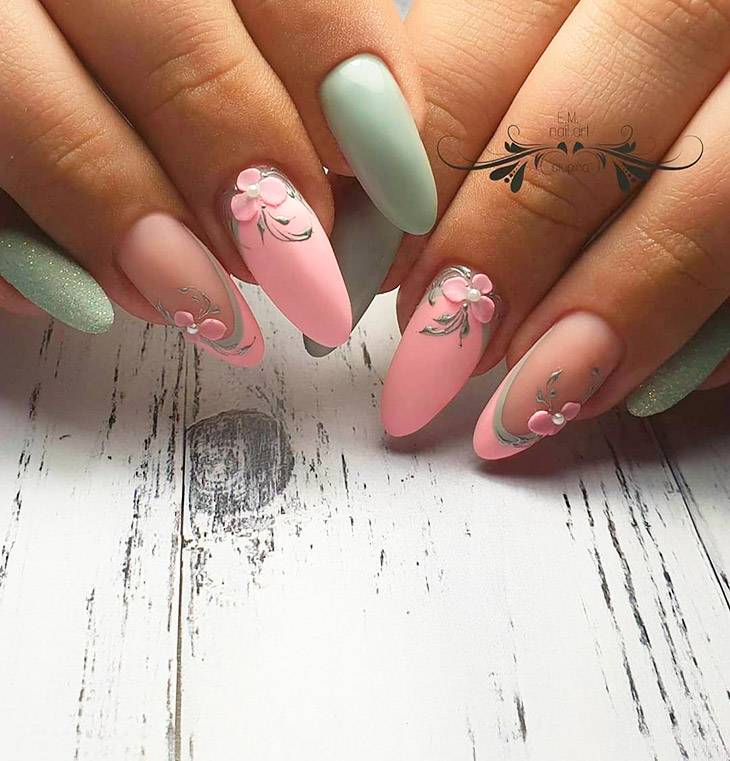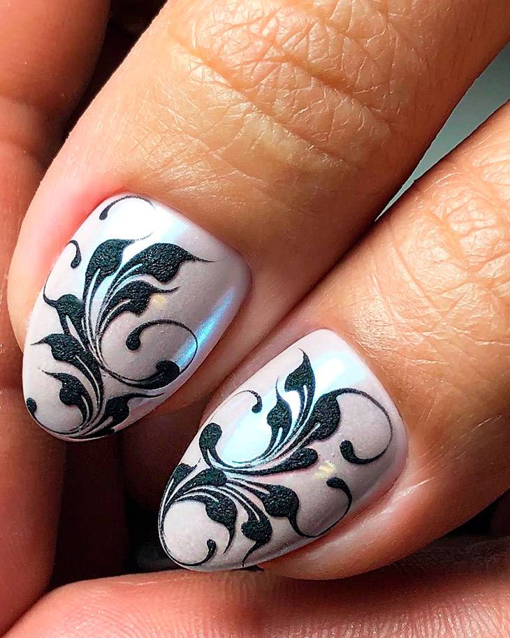 Здесь так же важно не переборщить. Узорами с завитками можно украсить один ноготь, сделав на него акцент, а остальные оставить в однотонном варианте. Трендовые узоры на овальных ногтях могут быть абсолютно любыми — это всё зависит от желания самой женщины и умения мастера