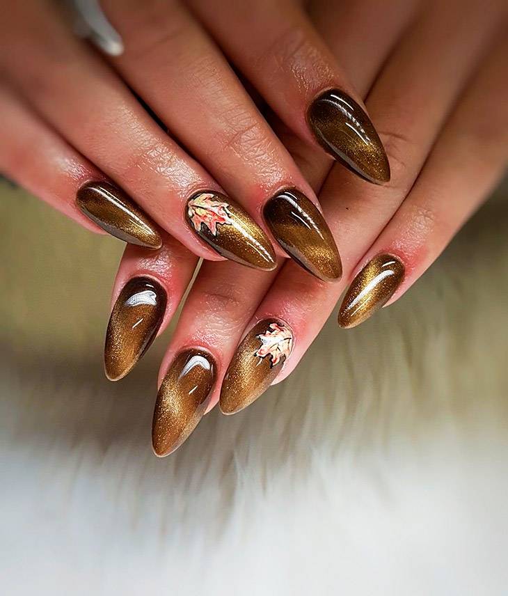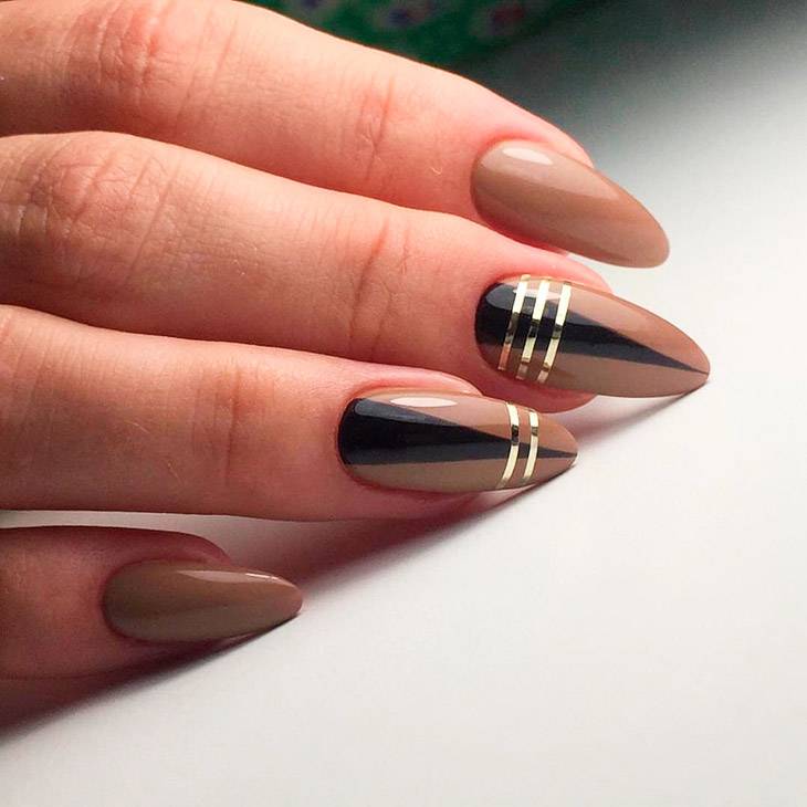 Тяжелое сочетание для формы овала. К коричневому и шоколадному цвету мастера рекомендуют использовать втирки, либо фольгу.