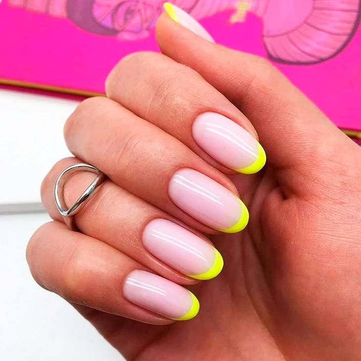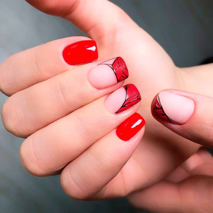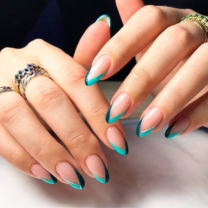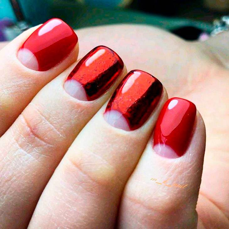 Хороший вариант — контрастный френч. Сочетается чёрно-белые, темный-оранжевый. Проигрышное сочетание — красно-зелёный, его стоит избегать.