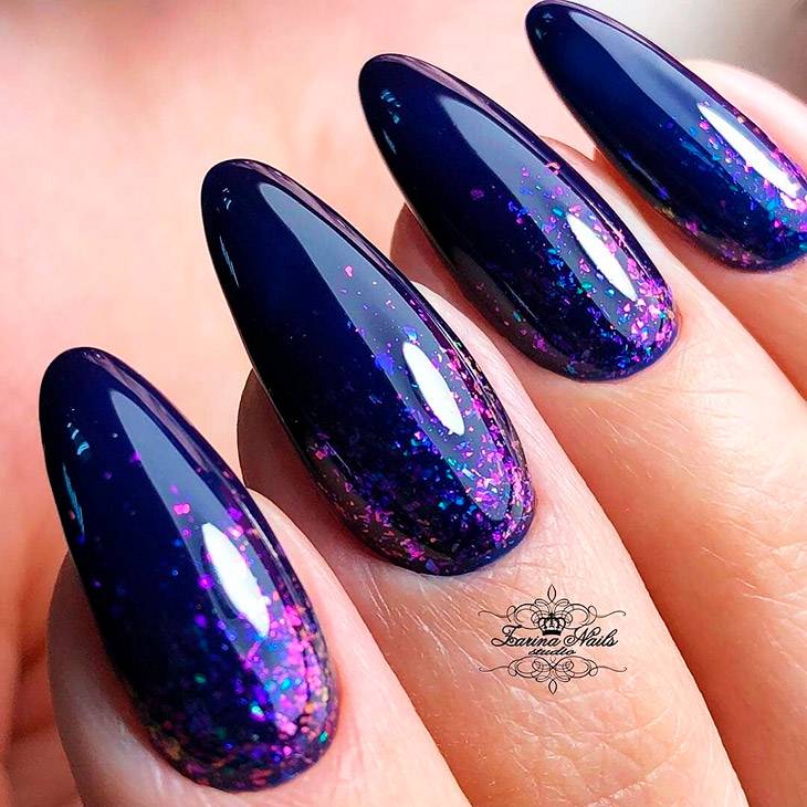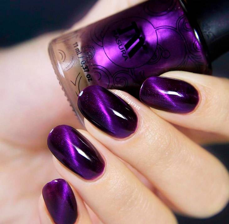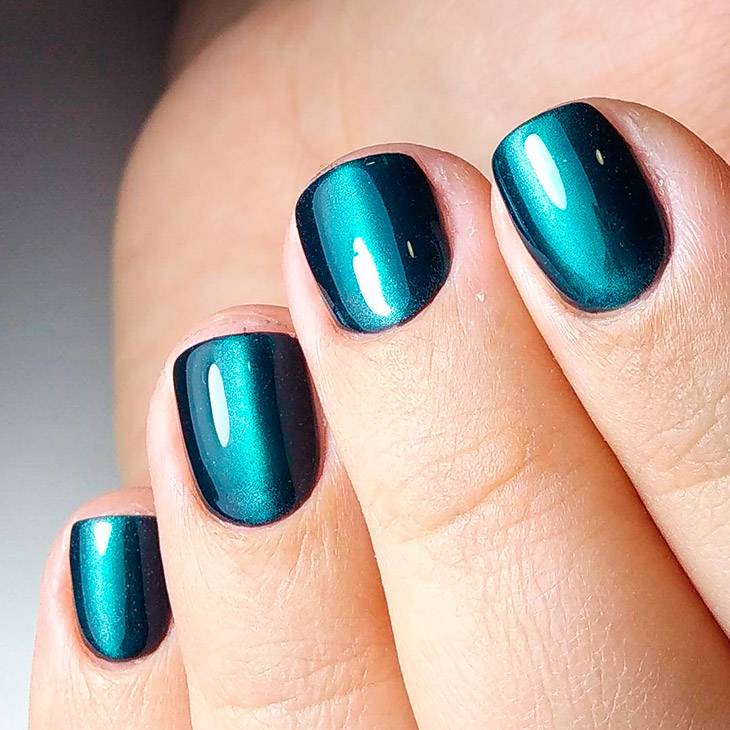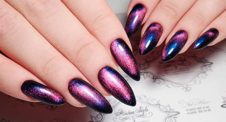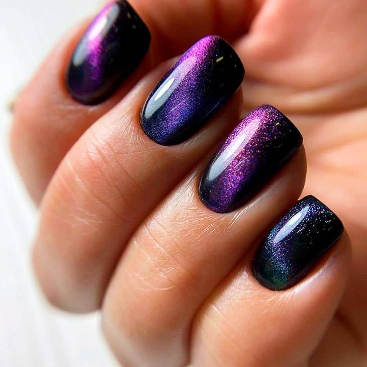 Однотонные ногти можно сравнить с «чёрной дырой», а использование втирок добавит ощущение космоса. Такой цвет выглядит загадочно и влекущее.