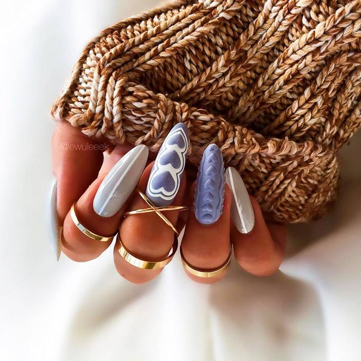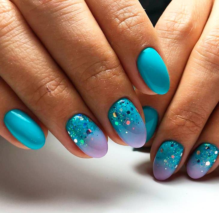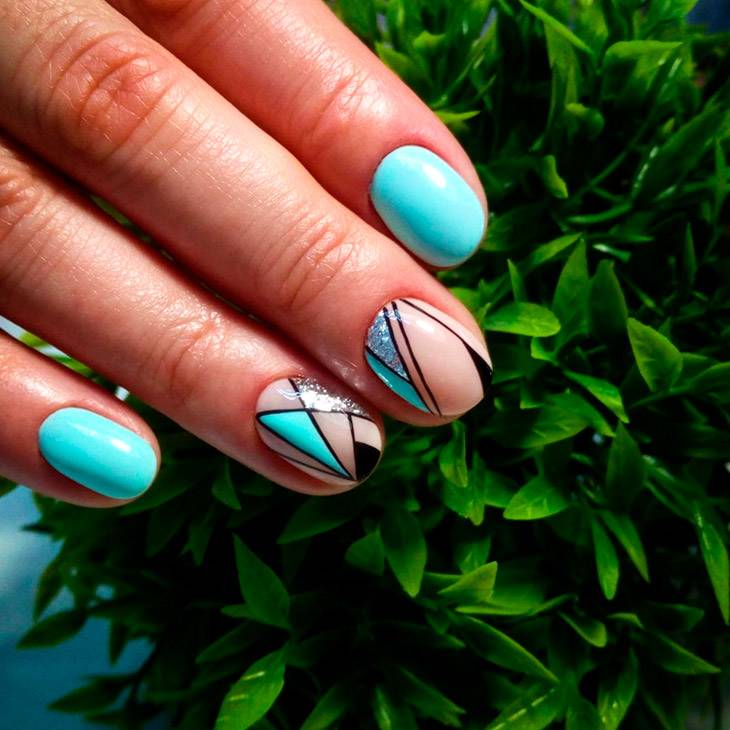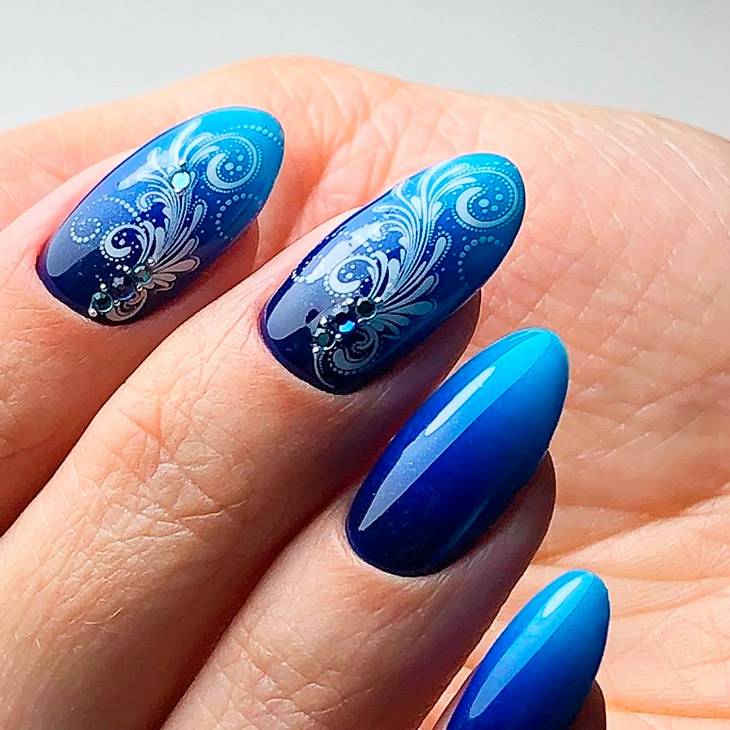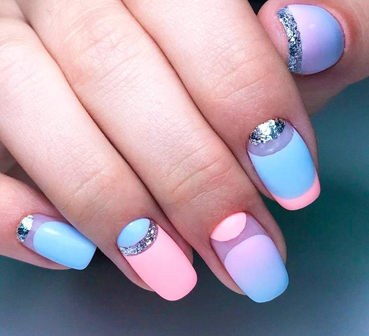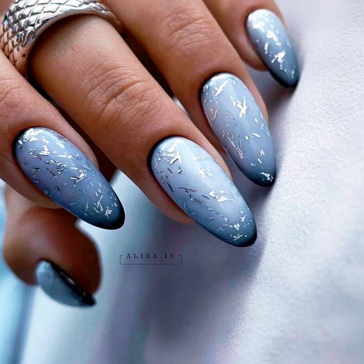 Хорошее сочетание, выходящее в тренд на зиму этого сезона. Холодные оттенки в овальном маникюре, в сочетании с фольгой, создадут «сказочное» впечатление. Голубой пастельный цвет подчеркнет форму, благодаря стразам, либо рисункам в белых тонах.