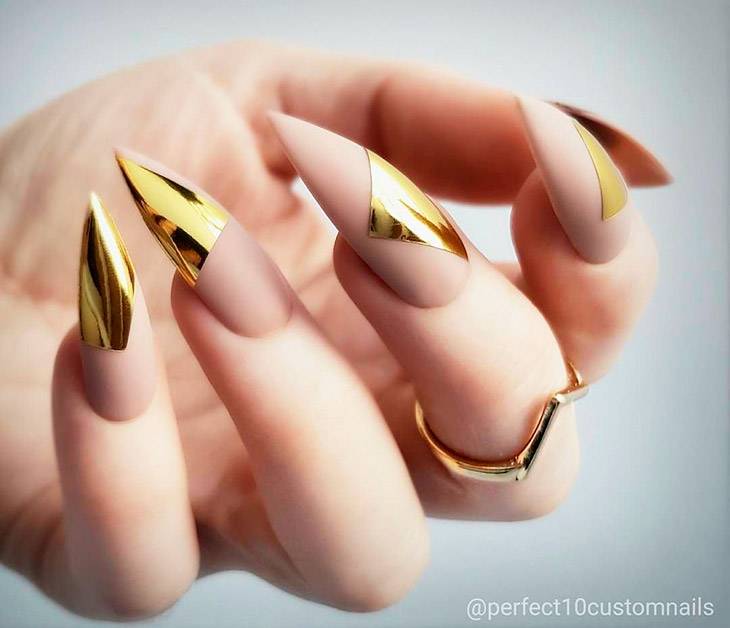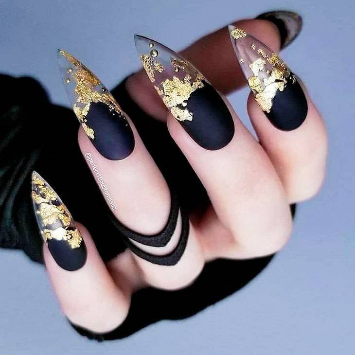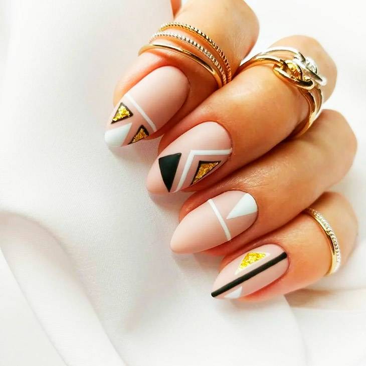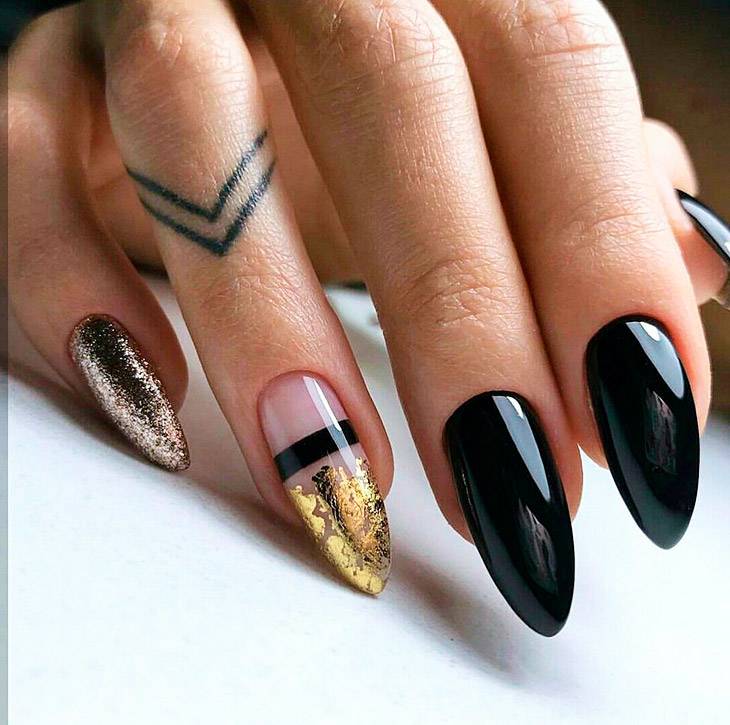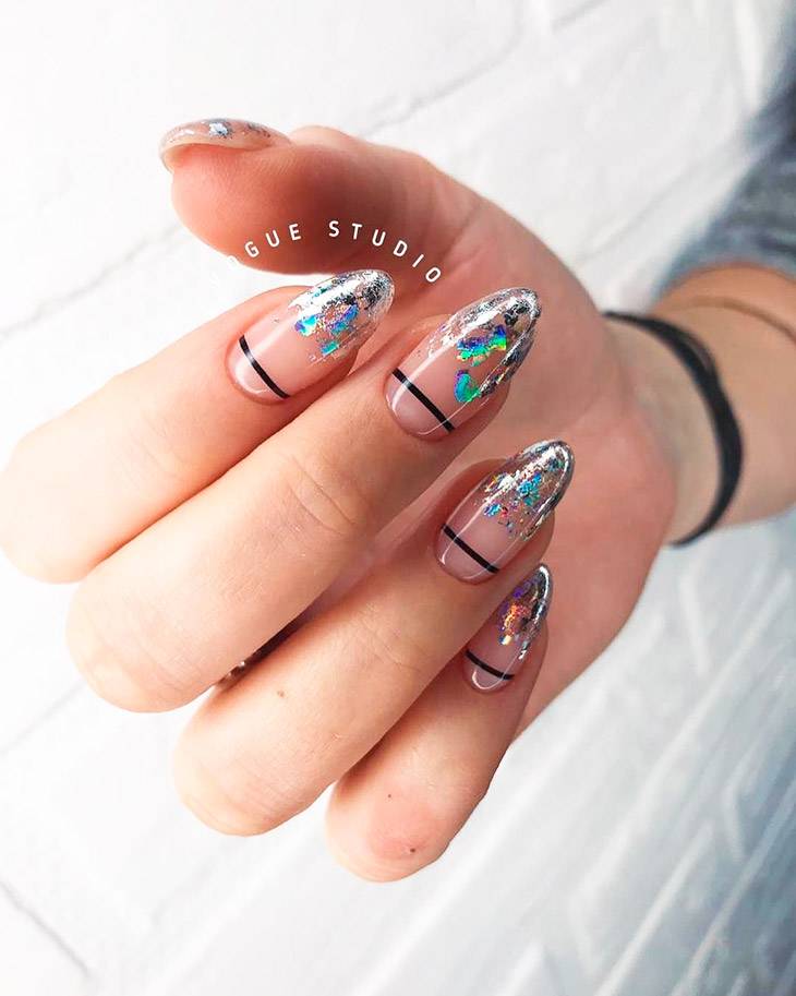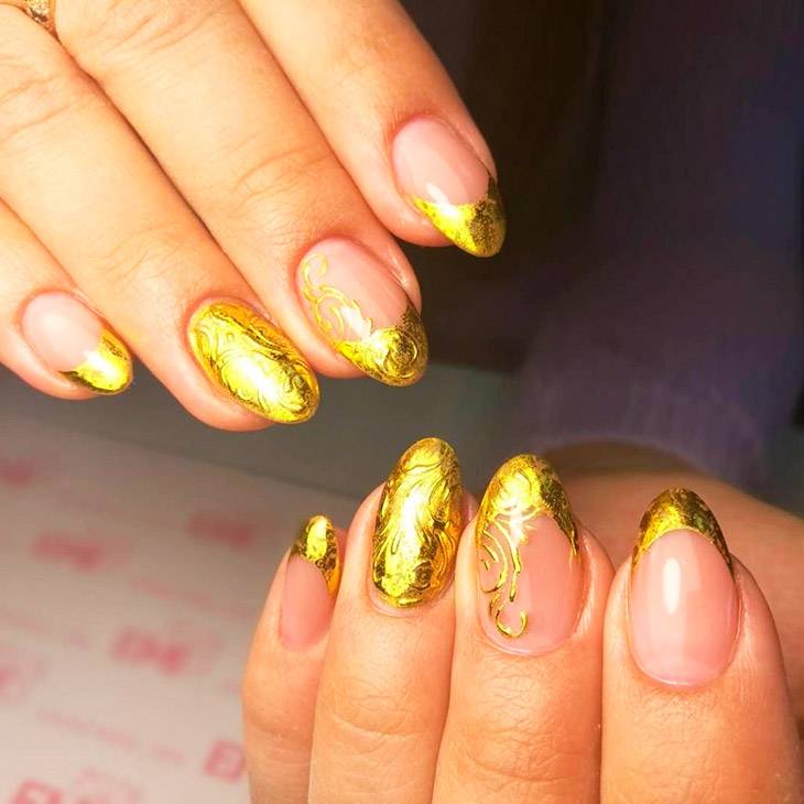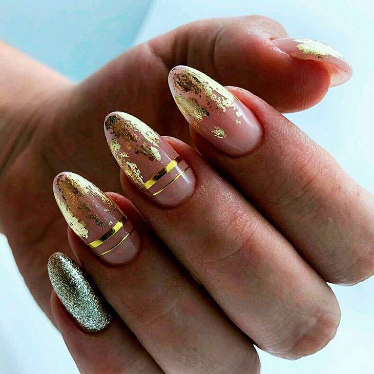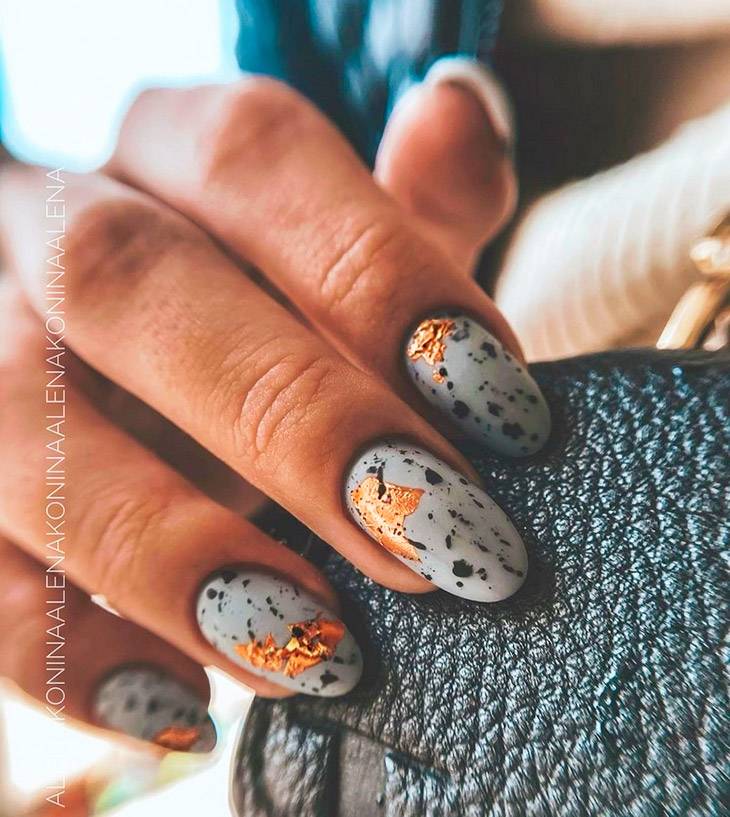 Лучшее сочетание для визуального удлинения ногтей. Овальная форма, естественно, сыграет в этом свою роль. Хорошо будет выглядеть с «брызгами», сделанными из фольги.