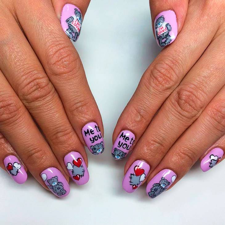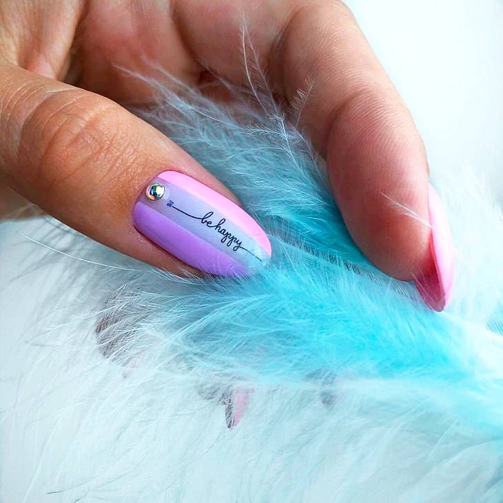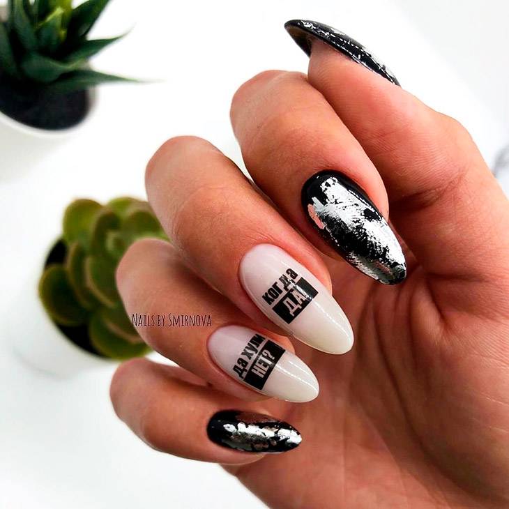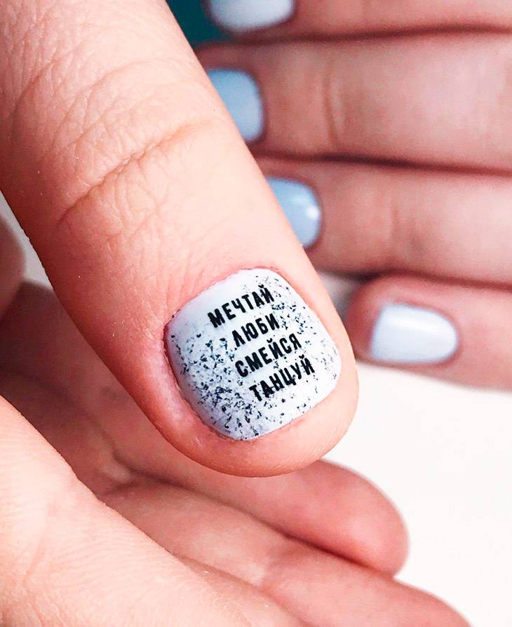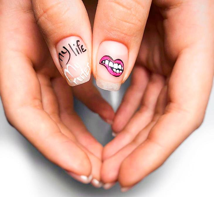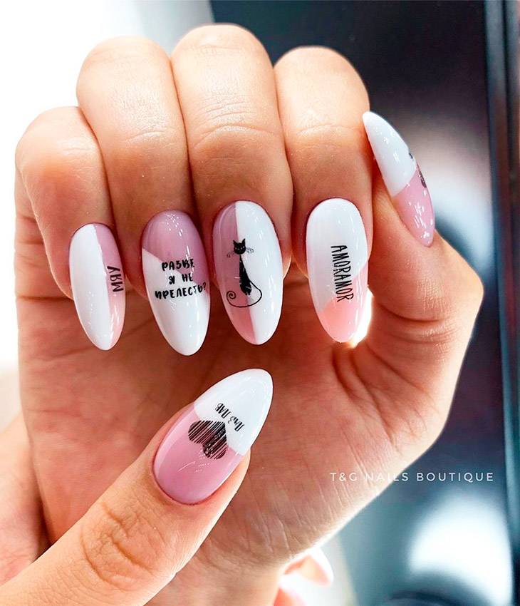 Овальный дизайн ногтей хорошо сочетается с надписями. Однако стоит учесть шрифт. Нежность овала подойдет для курсива, а вот жирные буквы только испортят впечатление.