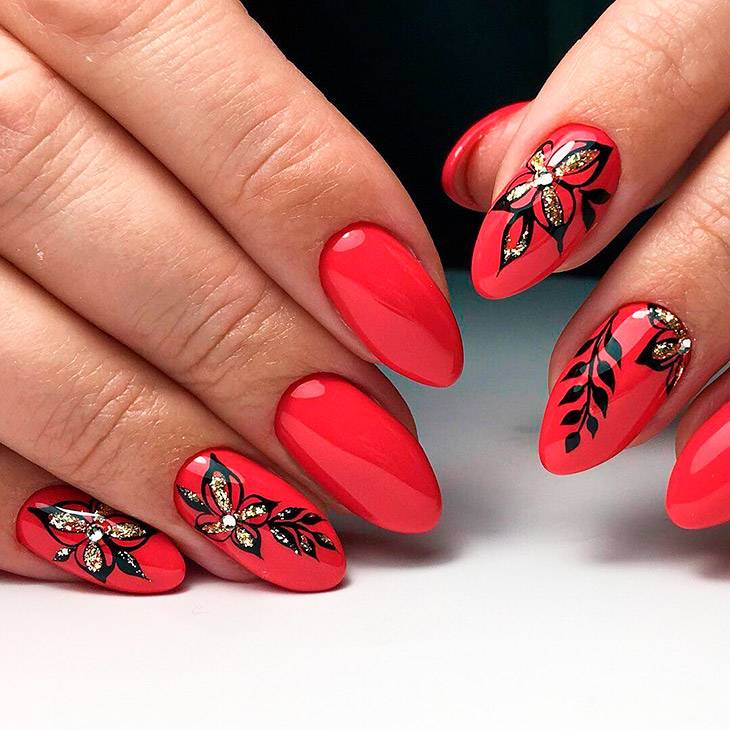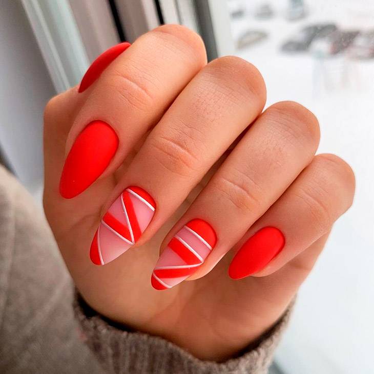 Ярко-красный цвет и ногти — всегда убийственное сочетание, правда маникюр на овальную форму слегка его смягчает. Более тонкие оттенки красного подойдут под любую длину, но яркий — только под длинные.
