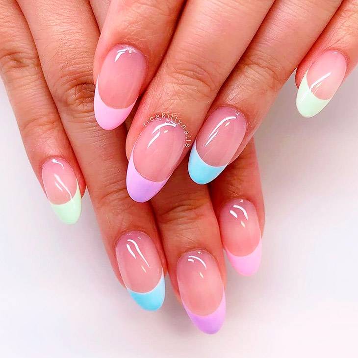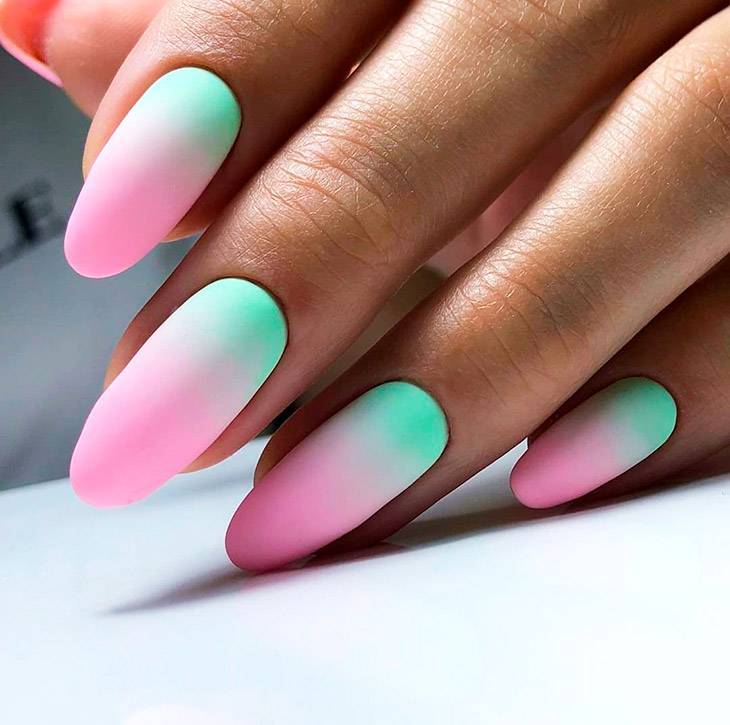 Градиент и омбре и остаются хорошим выбором для сдержанного овального маникюра с небольшой ноткой таинственности. Хорошо сочетается классические чёрно-белые, либо пастельные цвета, к примеру, от розового к голубому.