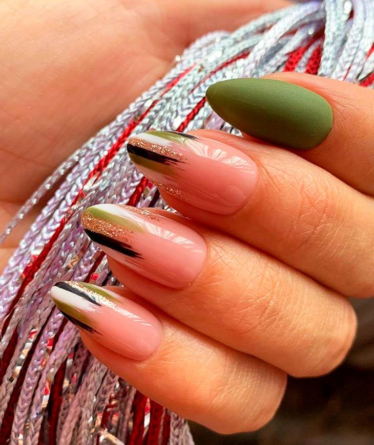 Цвет, который вынесет не каждый. Однако зелёный и его травяные оттенки могут визуально вытянут длину овальных ногтей, поэтому здесь будет уместен дизайн с привязкой к какой-нибудь теме.