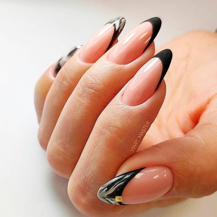 Чёрный цвет на овальных ногтях подойдет для неординарных девушек. Он хорошо сочетается со всеми видами дизайна, выигрышно смотрится при окрашивании френча.
