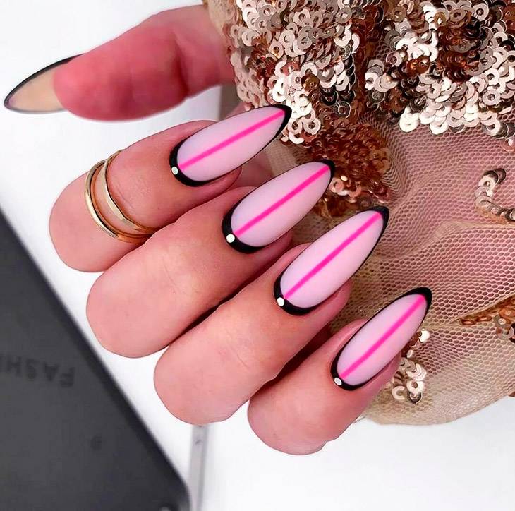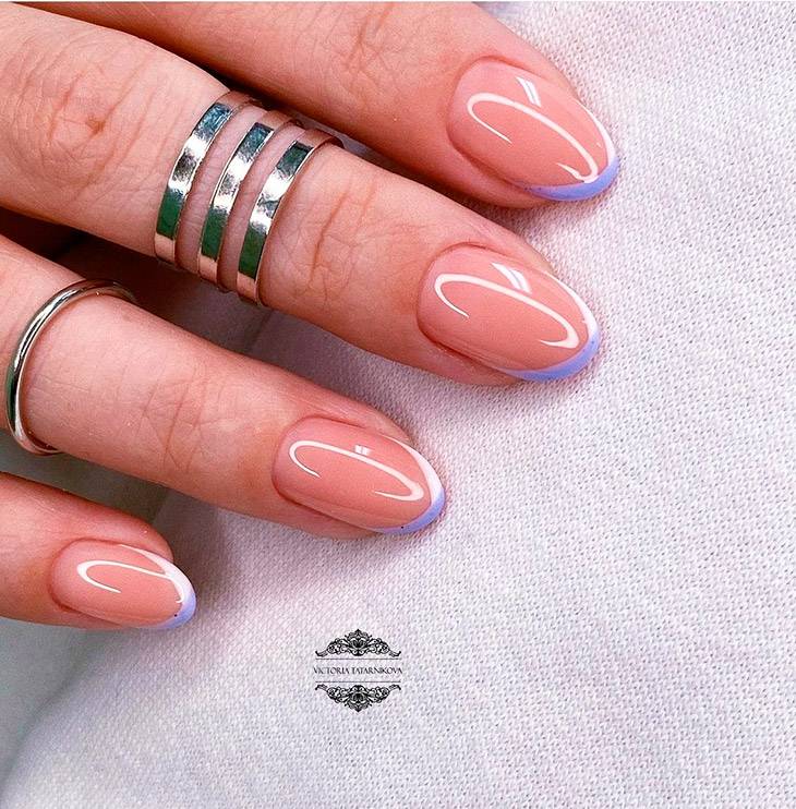 С одной полоской, овальная форма сочетается лучше, чем с несколькими. Такой вариант дизайна хорошо подходит для добавления в пастельные тона красок. К примеру, на персиковом провести мятную линию.