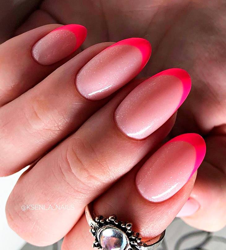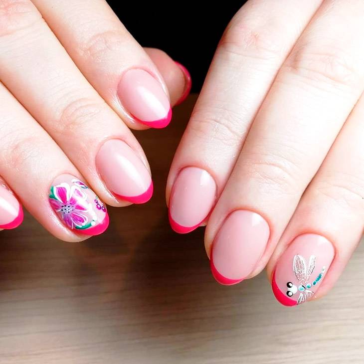 Персиковый цвет проигрывает в однотонности маникюра на овальные ногти. Следует дополнить дизайн рисунками, либо использовать контраст — к примеру, яркий акцент, повторяющий форму кончиков.