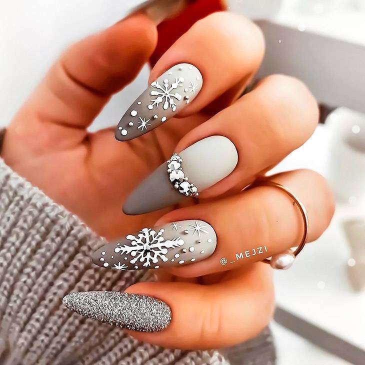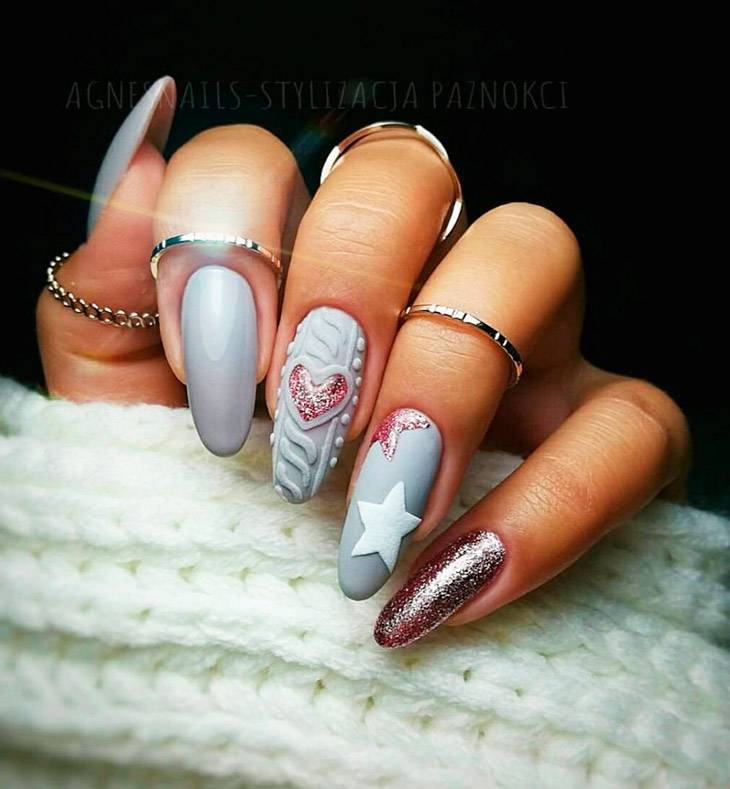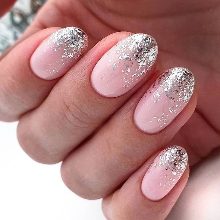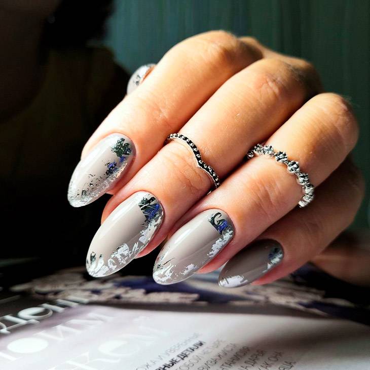 Серый цвет попросту обреченный партнёр для дизайна овальной формы, так как в этом сезоне мода на минимализм и лаконичность. Лучшим выбором будут тёмные оттенки с втиркой, либо стальные с глянцевым покрытием. В особенности маникюр хорошо будет выглядеть с фольгой, либо блестками серебристого цвета.