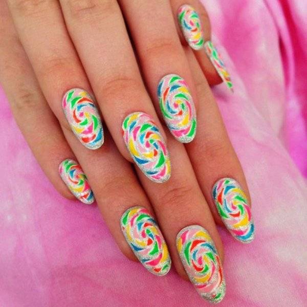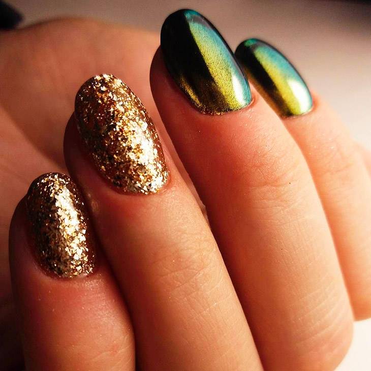 Разноцветный маникюр на овальные ноготки с блестящим акцентом.