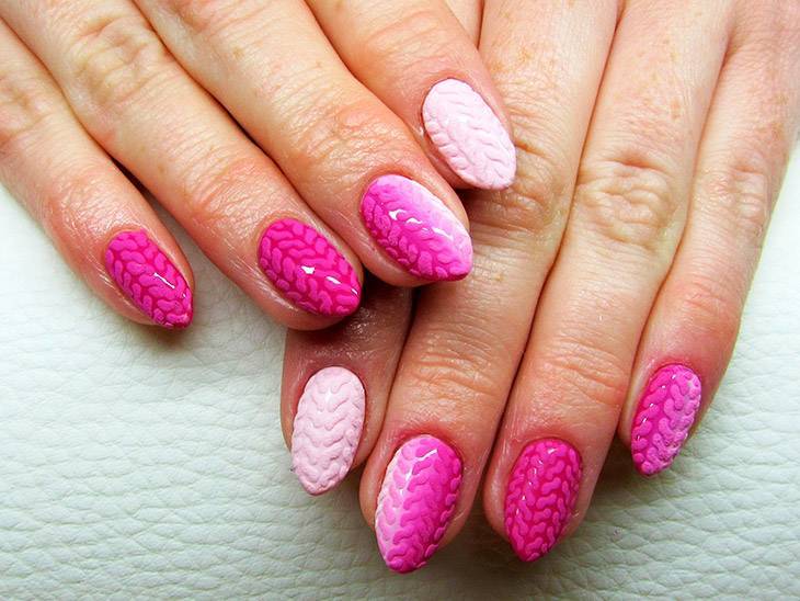 Совершенно не рекомендуется делать вязаный свитер, поскольку тренд уже устарел. Но, тем не менее, дизайн на овальных ногтях выглядит весьма уютно.