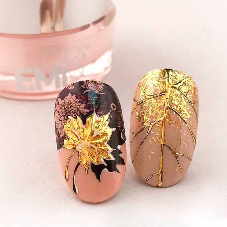 Хороший вариант для коротких овальных ногтей. Отлично будет выглядеть в тёмных оттенках. Здесь же можно обыграть приглушенный оранжевый, даже рыжий цвет, который не совсем подходит для такого дизайна в обычном применении.