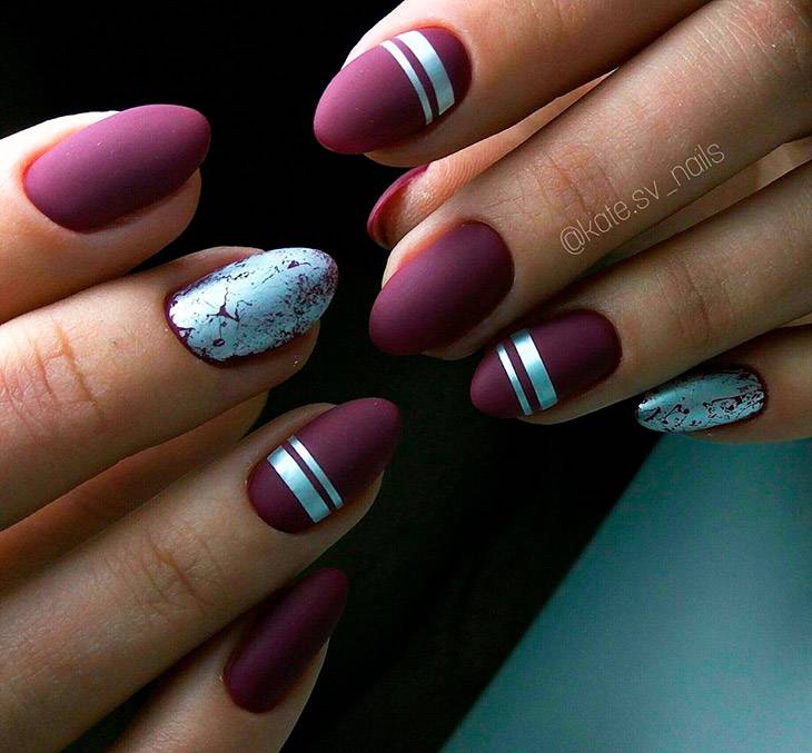 Бордовый цвет в тренде, элегантный, особенно хорошо выглядит с матовым покрытием и стразами. Можно дополнить золотой фольгой, а вот рисунки слегка теряются в насыщенности.