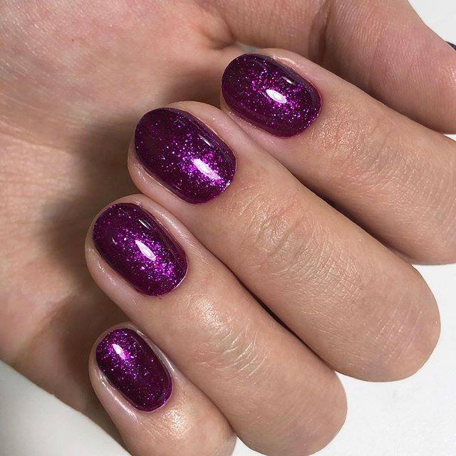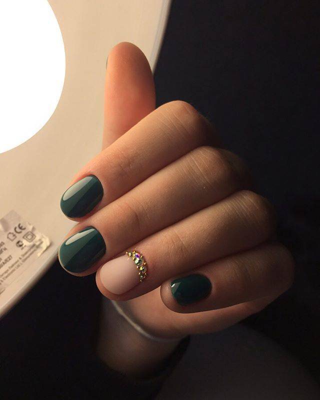 Примечательно, что используя темные тона, лучше всего добавить несколько разнообразных фактур в маникюр, например сочетание матового топа и втирки с эффектом металлик, либо использовать мерцающие лаки для хитового дизайна «кошачий глаз».