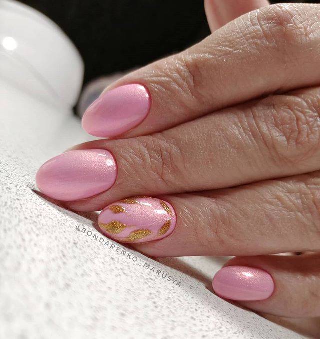 Довольно эффектно и необычно на коротких овальных ногтях будет смотреться такой популярный вариант дизайна как кракелюр из фольги или мраморный маникюр.
