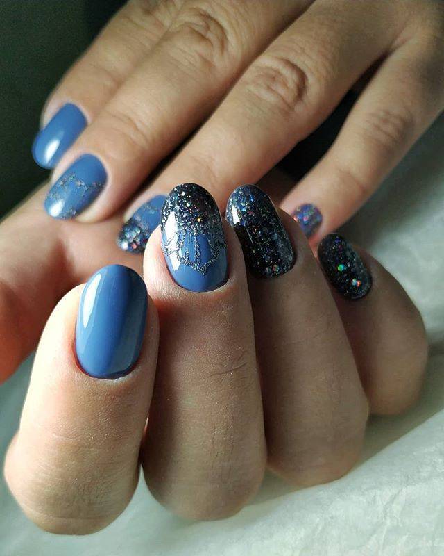В фото примерах готовых работ просматривается удивительное сочетание на одной руке контрастных оттенков, нескольких видов блестящего декора и комбинирование техник, без малейшего намёка на суперсложность выполнения.