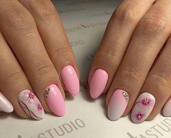 Особой нежностью на руках обладает эффект градиента. В основном используют светлые оттенки. Аккуратно исполненная растяжка добавляет рукам настоящую утонченность. Этот вариант отлично дополняют тонкими веточками, цветами, фольгой или блеском.