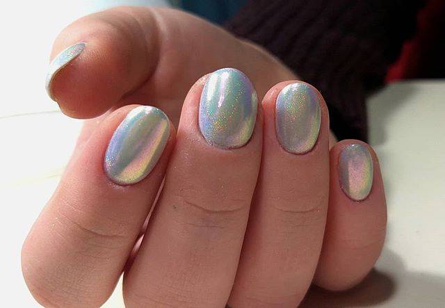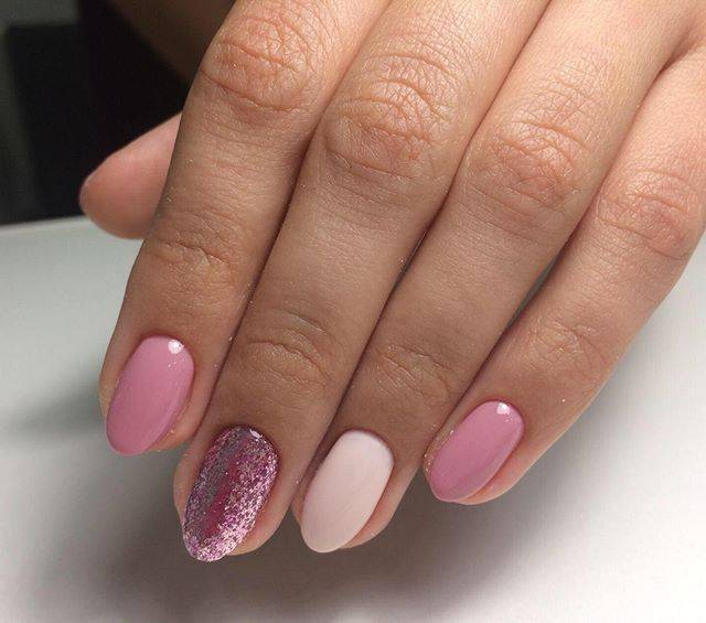 Глянцевую поверхность можно дополнить акриловой пудрой или песком, мелкими блестками или микробисером. Востребованным останется использование жемчужной или перламутровой втирки, которая сделает маникюр на овальные ногти по-настоящему сказочным и волшебным.