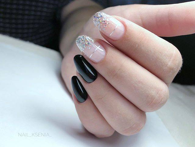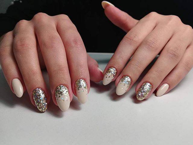 Кажется блестки уже никогда не выйдут из моды нейл арта. Несмотря на всю помпезность, этот вариант дизайна выбирает большое количество женщин. Чтобы снизить эффект новогодней елки, блестки сейчас используют в самом выгодном варианте. Можно покрыть несколько ногтей, а можно растянуть их от кутикулы к краю, создавая эффект градиента.