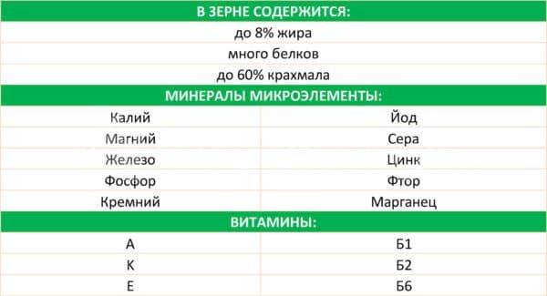 Это злаковое является рекордсменом по содержанию витаминов и минеральных веществ, которые, (что не мало важно!), легко усваиваются нашим организмом. Витамины: А, группы В, РР, Е, а также железо, марганец, кремний, сера, фосфор, йод, кальций, калий, магний — оказывают положительное действие на здоровье и красоту кожи