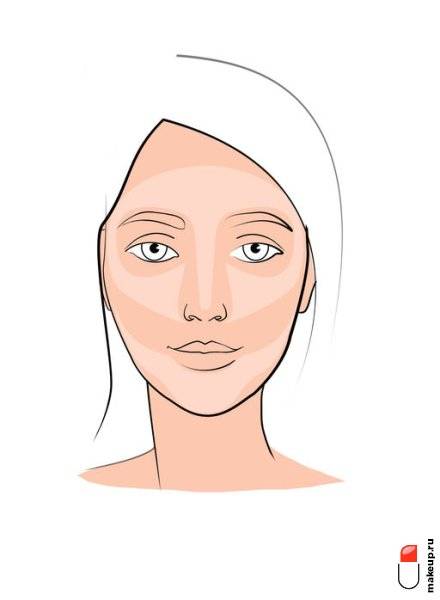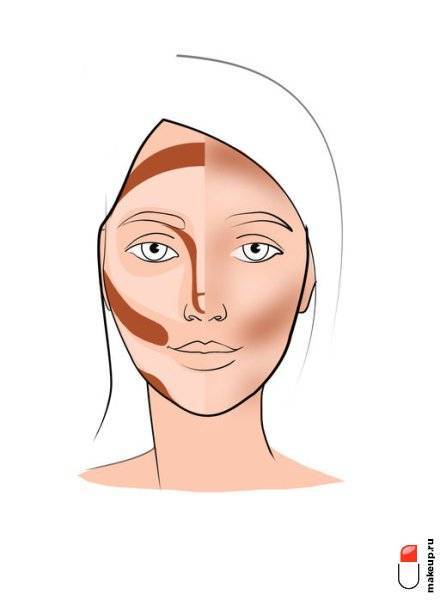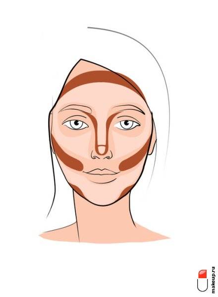 - Сузить круглое лицо поможет бронзер или темная пудра, нанесенная на виски. Линия, проведенная под нижней челюстью, укоротит удлиненный подбородок. Чтобы сделать лицо более рельефным и изящным, под скулы наносят штрихи бронзатором или темными румянами, а на яблочки кладут тонкий слой светлых розовых румян.