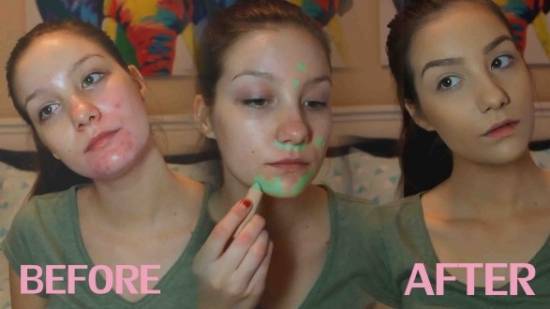 - при нанесении зеленого корректора для борьбы с красными прыщами эти места нужно сверху аккуратно припудрить – это позволит добиться лучшего эффекта;
