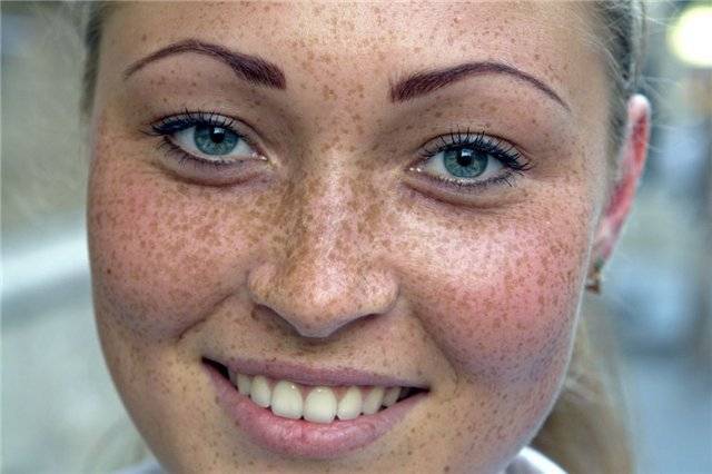- Пигментные пятна, прыщи, и веснушки на деле маскируются проще всего. Если цвет достаточно светлый, можно обойтись корректором телесным, если прыщ воспалился – зеленым. Карандашом или стиком наносится точка, границы ее растушевываются, а кожа припудривается.