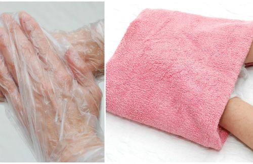 6. Получив такую «перчатку», руки необходимо обернуть целлофаном, а сверху надеть варежки либо при их отсутствии замотать кисти шерстяным шарфом. Ваша цель – заставить руки пропотеть, чтобы достичь максимально заметного результата.