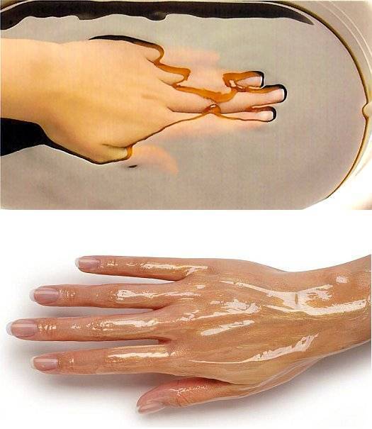 5. Наконец, основной этап – опустите руки в парафин. После этого следует еще несколько раз (примерно 5) погрузить руки в волшебное средство, чтобы получить результат в виде плотного покрытия на коже.
