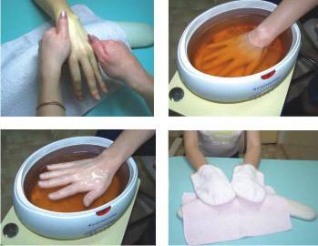 - Теперь наступило время использовать парафин. 4 раза нужно окунуть руки в ванночку.