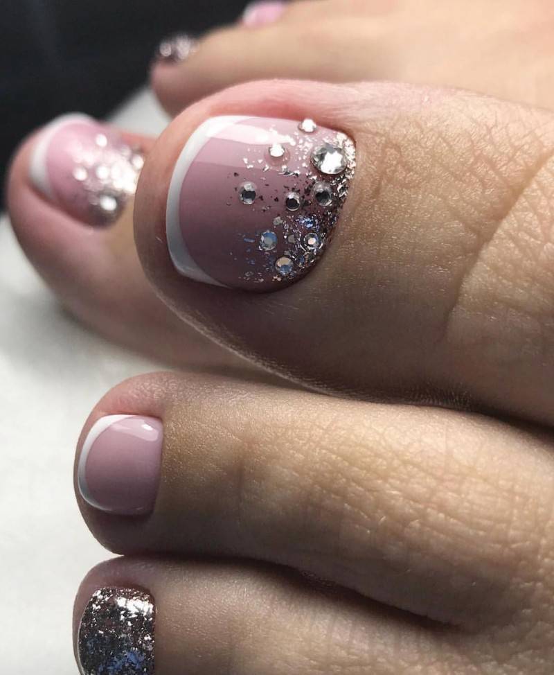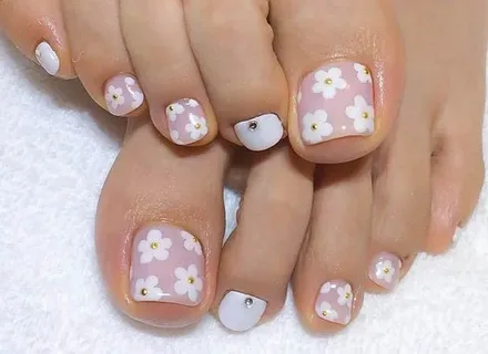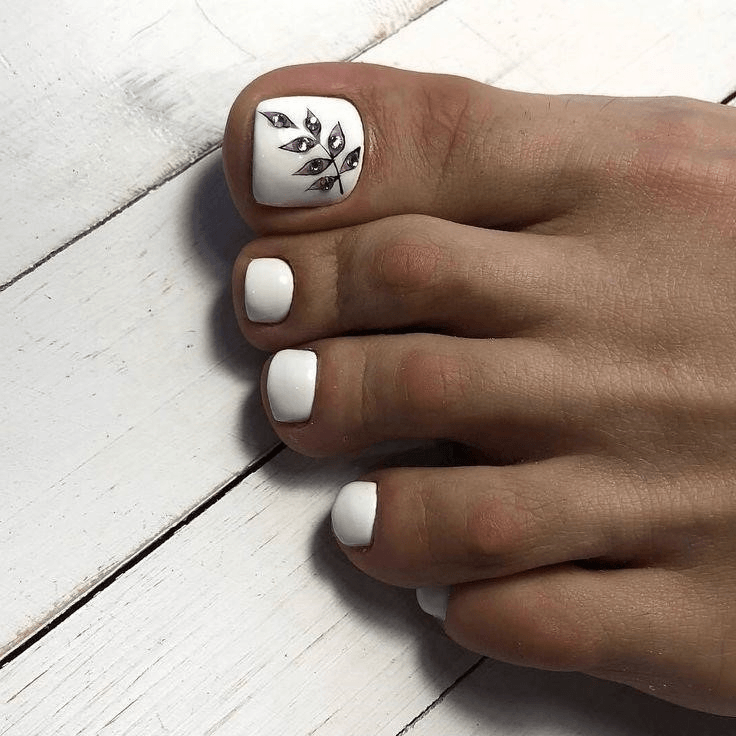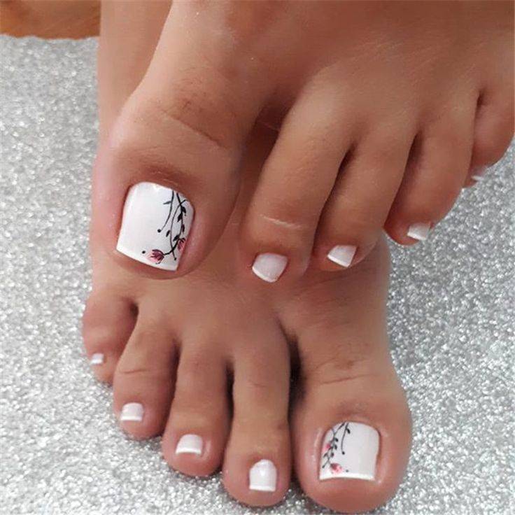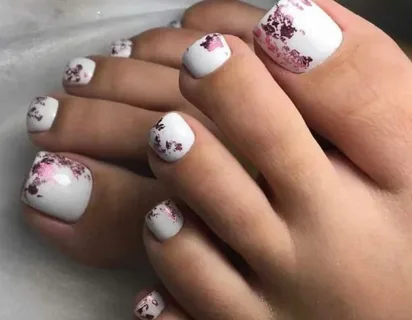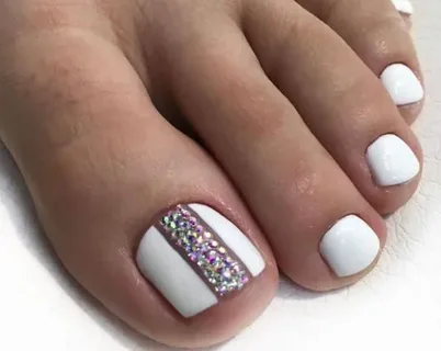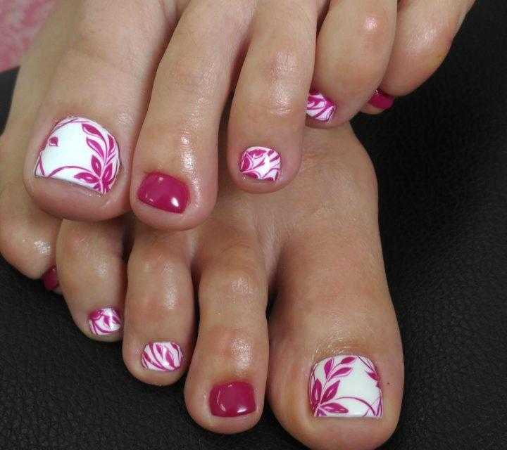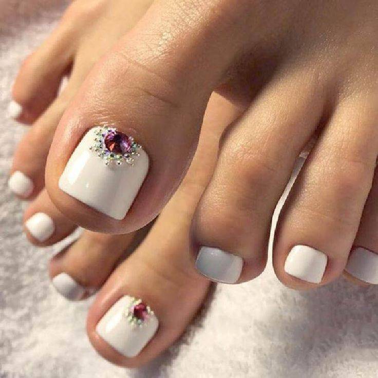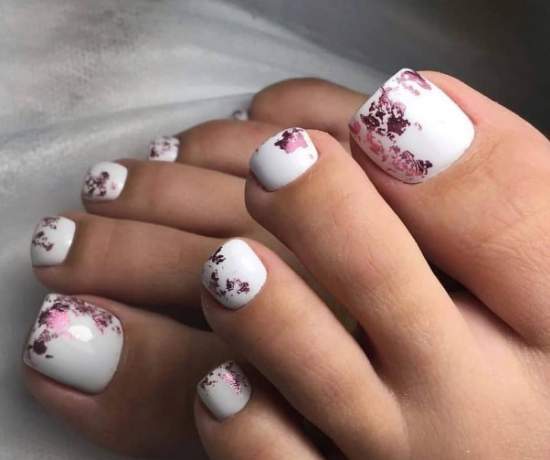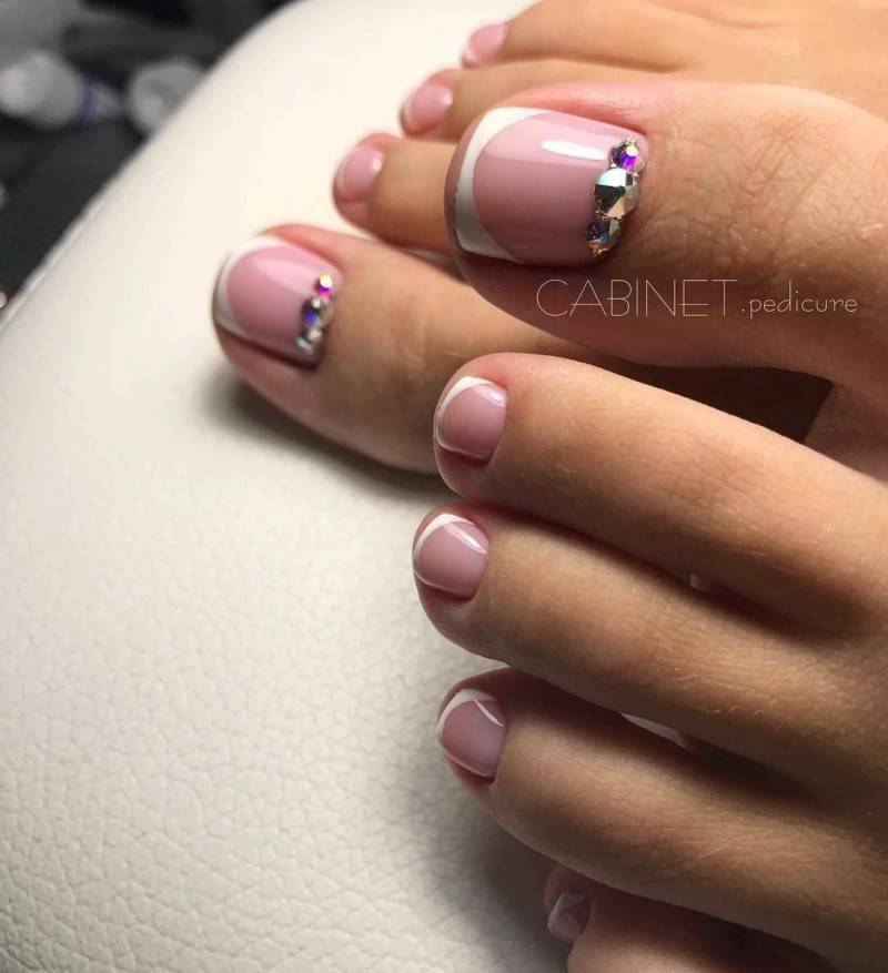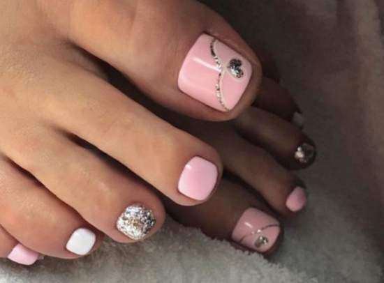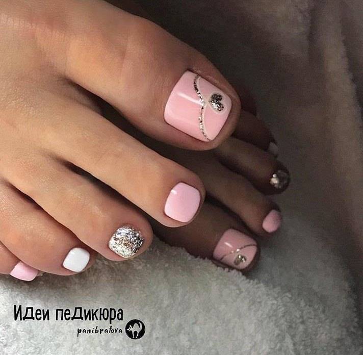Сочетание розового с белым считается наиболее распространённым дуэтом в дизайне ногтей. Однако, для создания гармоничной композиции, дизайнеры советуют придерживаться некоторых правил. Если в педикюре используется яркий розовый оттенок, то дополнение белого следует свести к минимуму. При выполнении педикюра в светлой гамме основного покрытия, допускается его акцентное использование. Белое покрытие может выделять один ноготь на большом пальце и дополнительно украшаться декором из страз, блёстками глиттера либо рисунком. Также очень красиво смотрится розовый педикюр с белыми деталями, которые немного разбавят однотонность основного цвета и сделают дизайн более нежным.