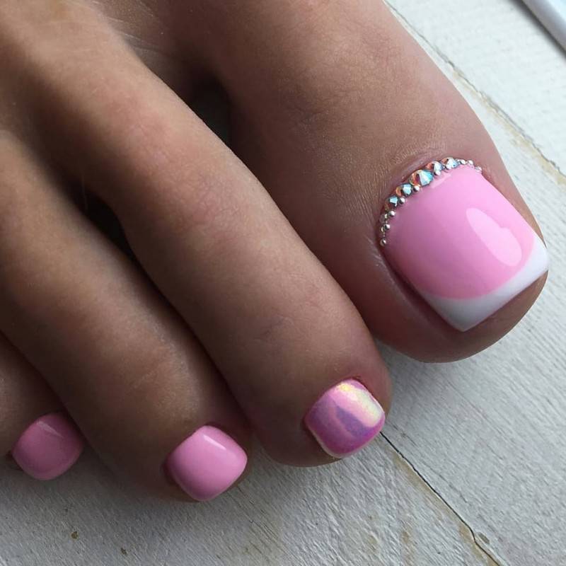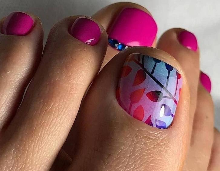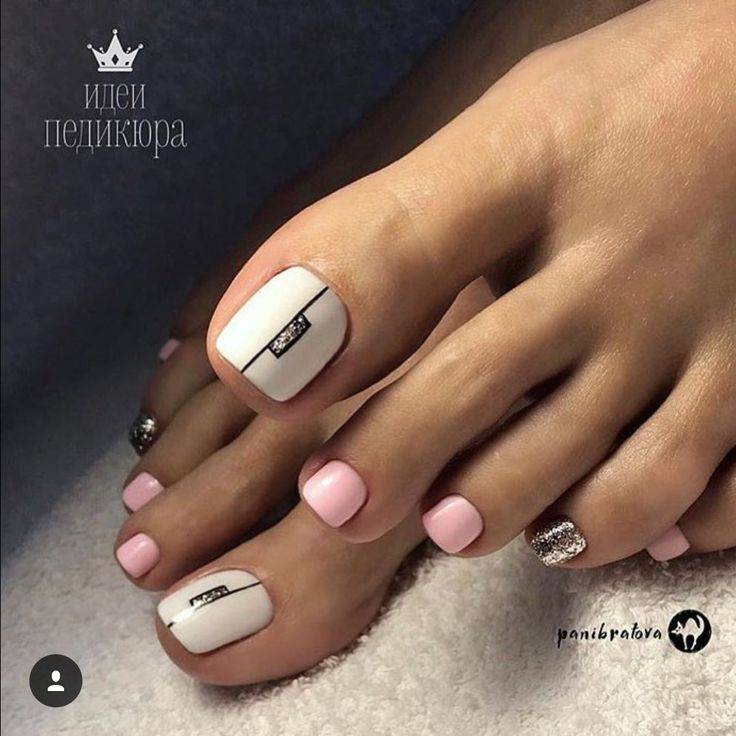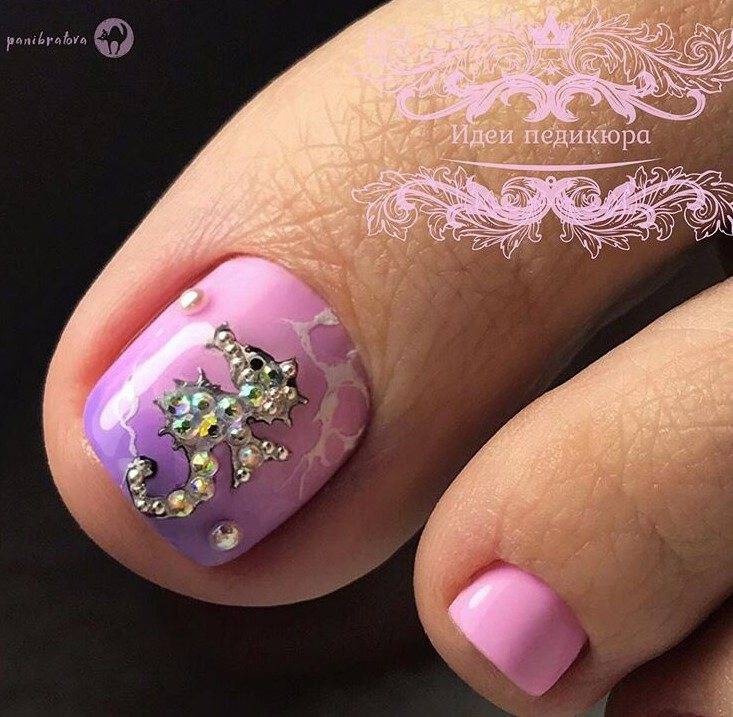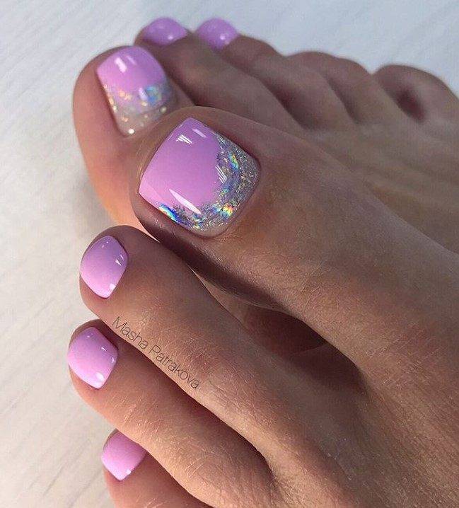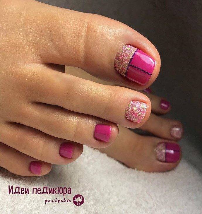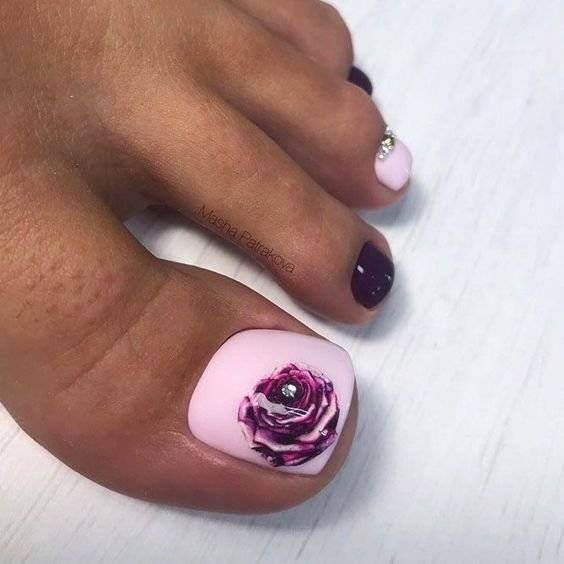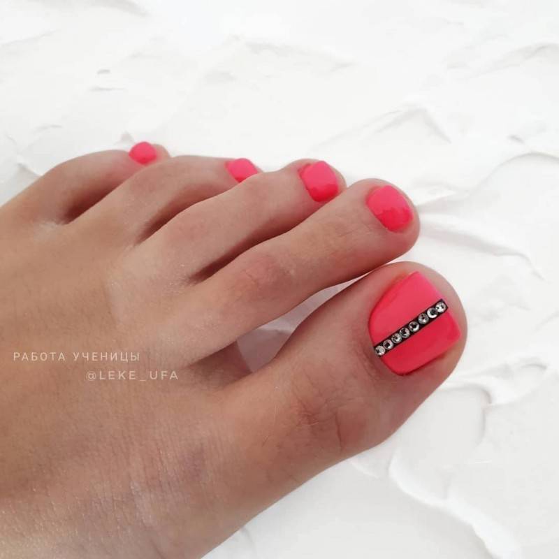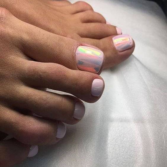 Эта идея для педикюра сочетает в себе блестящий опалесцирующий розовый на большом пальце и простые розовые ногти. Этот дизайн для тех, кто хочет похвастаться уникальным педикюром на своих ногах.