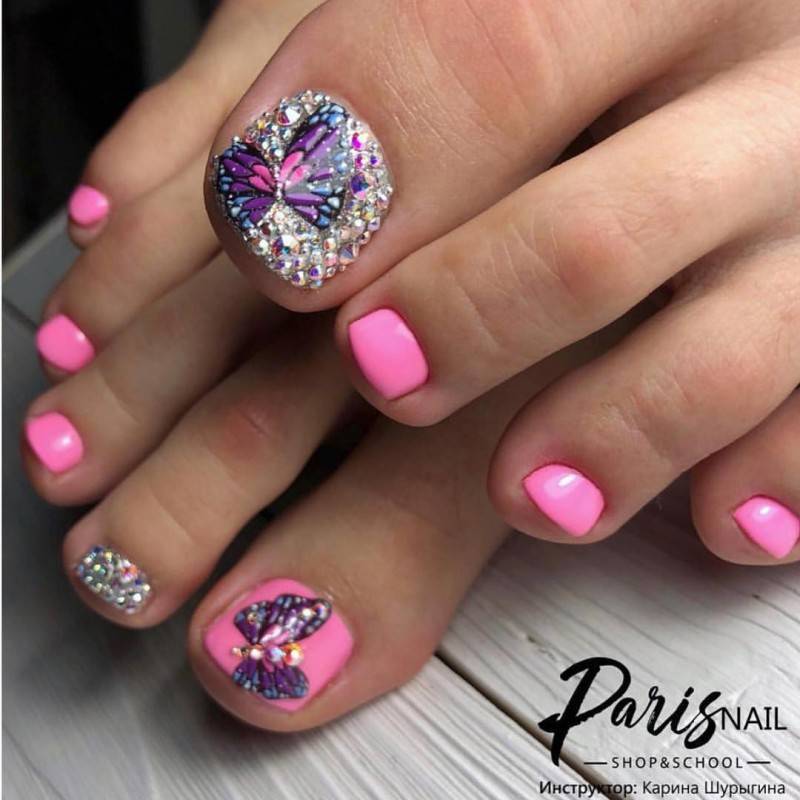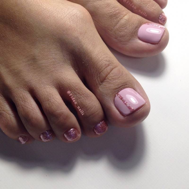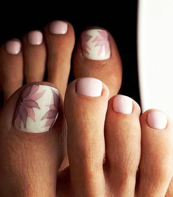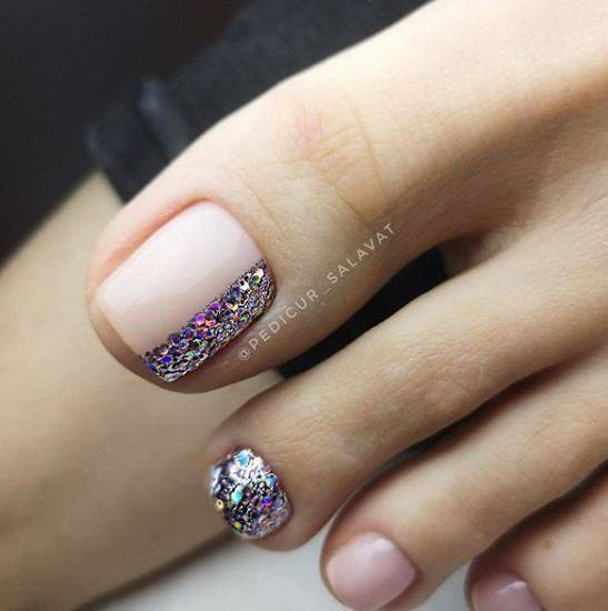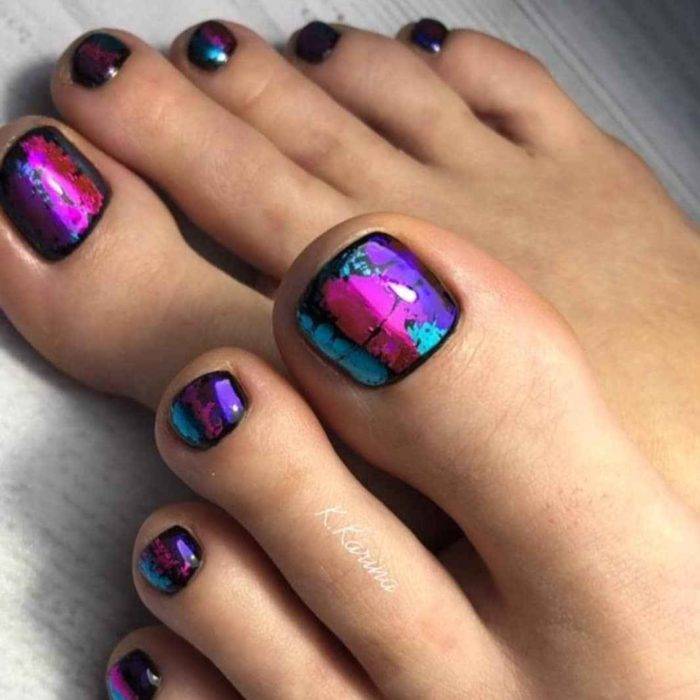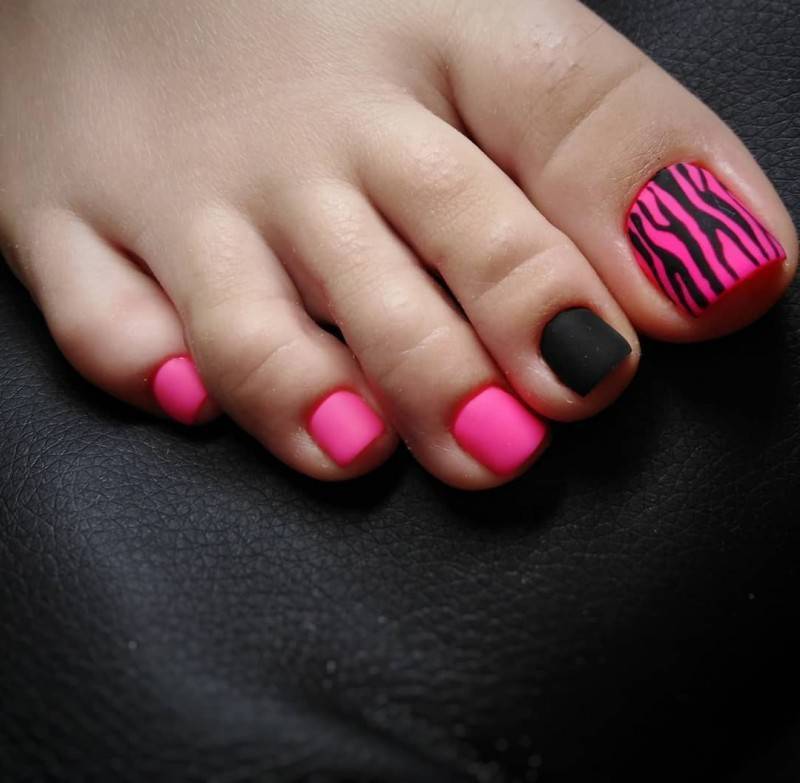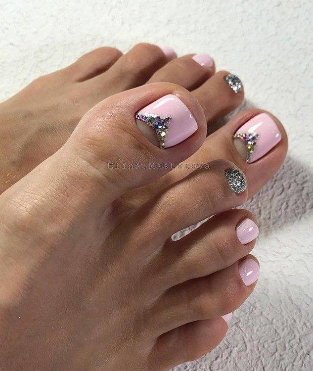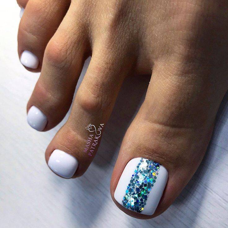 Эта идея для педикюра сочетает в себе блестящий опалесцирующий розовый на большом пальце и простые розовые ногти. Этот дизайн для тех, кто хочет похвастаться уникальным педикюром на своих ногах.