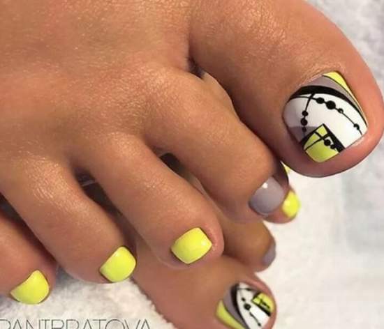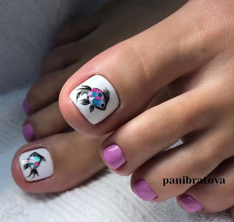 - рисунки – ногти на больших пальцах ног могут стать холстом для художника, в этом сезоне модными остаются рисунки в мультяшном стиле, надписи, примитивные силуэтные изображения, абстракция;