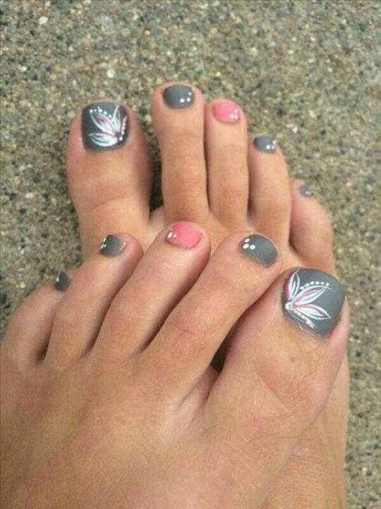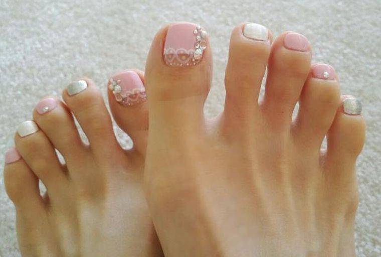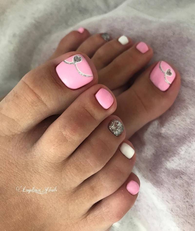 Сочетание в педикюре розового и серого характеризуется двумя направлениями. Нежный и спокойный дизайн оформляется гармоничным дуэтом холодного розового с аналогичным серым лаком. Тёплые оттенки палитр позволяют создать более яркий дизайн, и прекрасно подчеркнут детали образа или аксессуары. Покрытия могут оригинально чередоваться на всех пальцах или создавать красивый тандем на одном ноготке. Использование страз, бусин или глиттера в подобном примере только приветствуется.