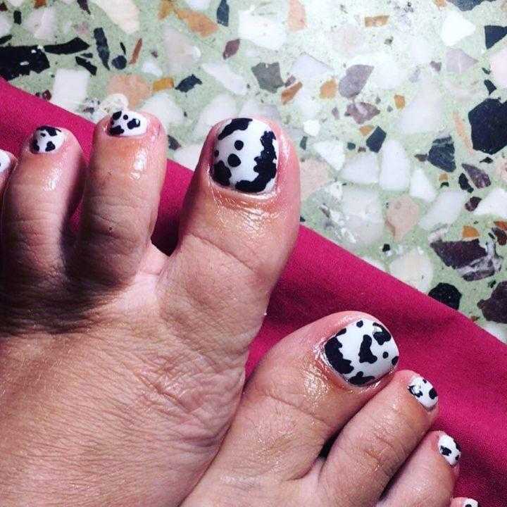 Коровий принт может украшать каждый ноготок вашей стопы, а может только большой. Он красиво будет сочетаться с классическим френчем, где зона улыбки выделена именно белым цветом. Хотя, ради эксперимента можно выделить ее черным. В любом случае получиться красиво, стильно, а главное необычно!