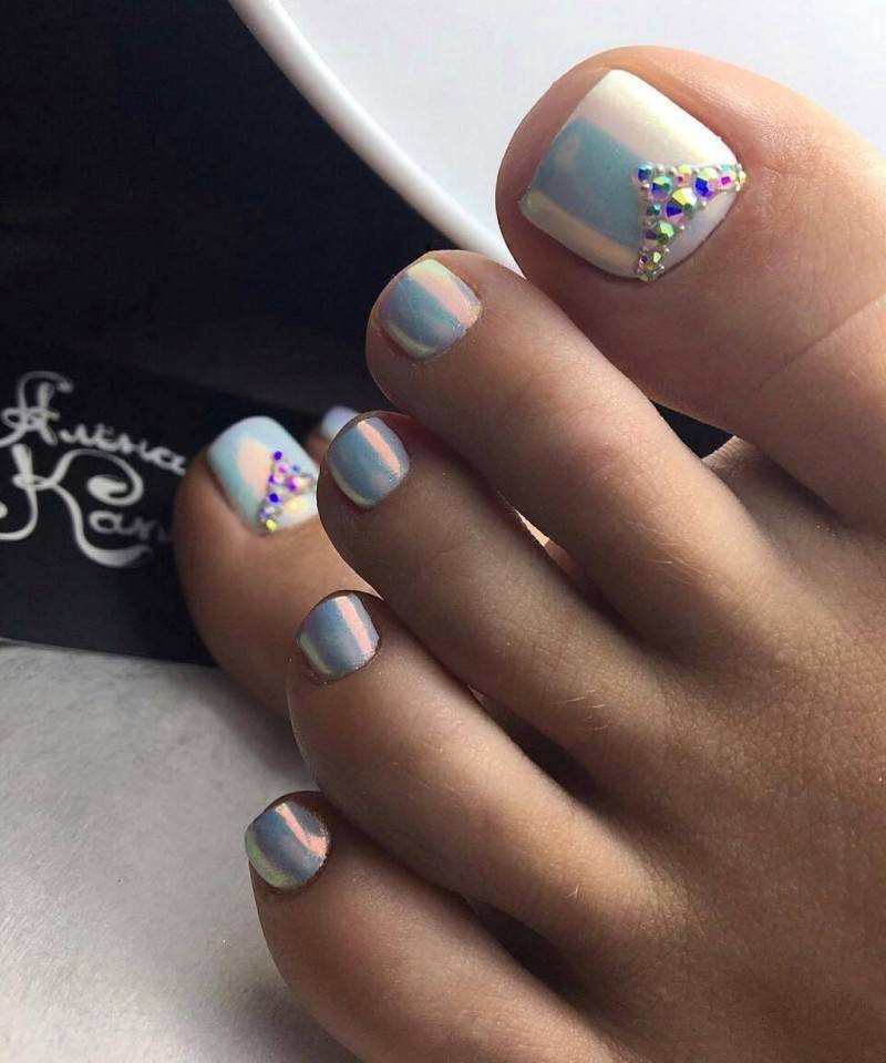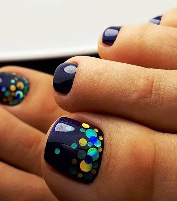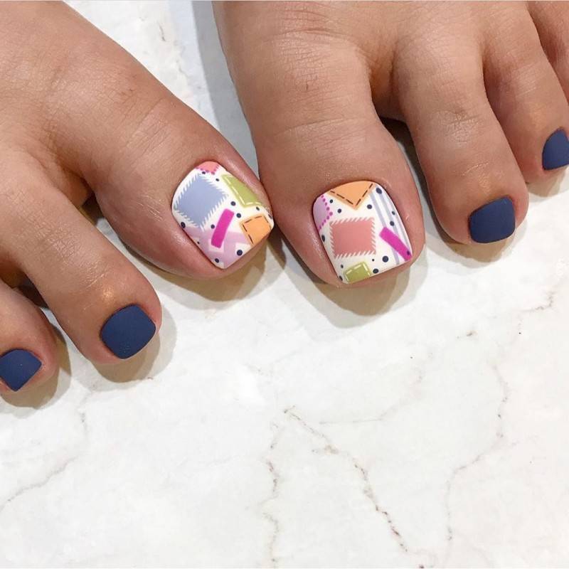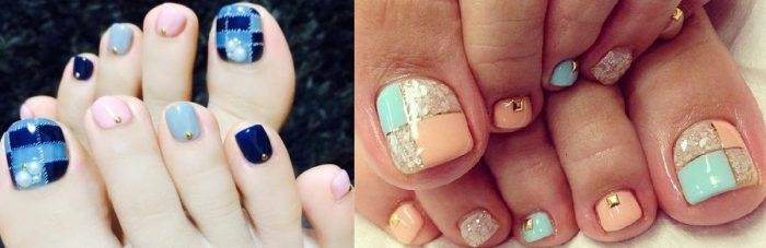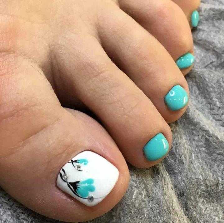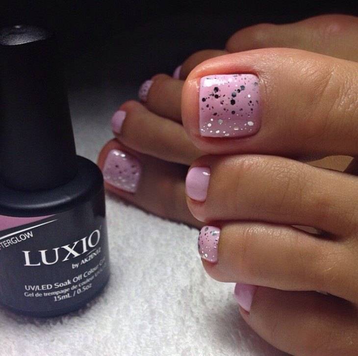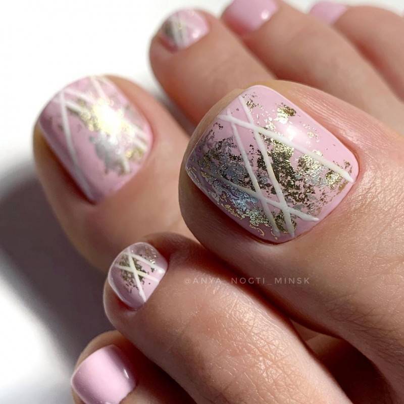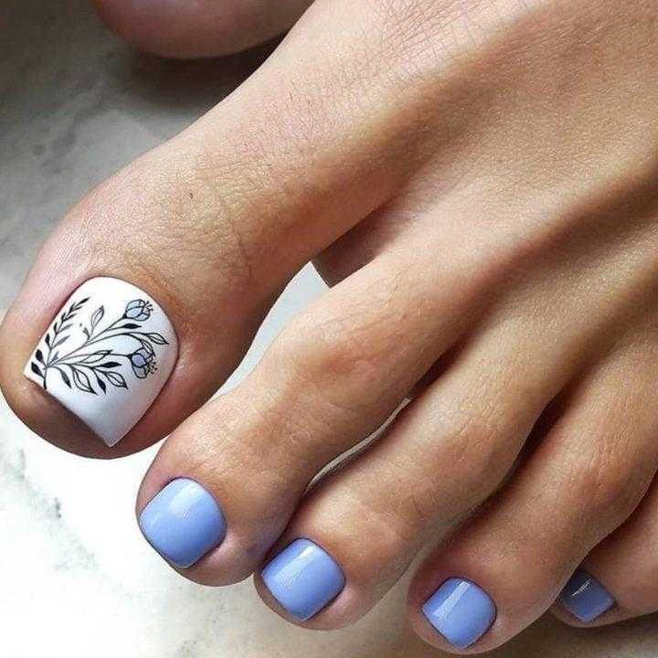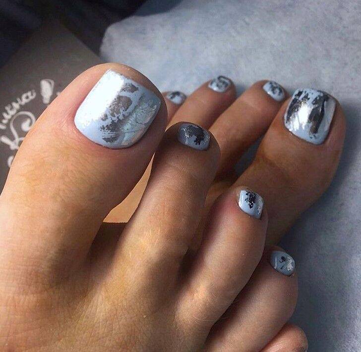 Такая идея оформления предполагает использование в педикюре пастельных оттенков. Голубой может красиво выделять акцентом только большой палец или принимать участие в создании всего педикюра. Дуэт розового и голубого очень красиво смотрится в плавных переходах градиента, геометрическом дизайне или элементах абстракции. В оформлении подобной идеи также можно дополнительно использовать другие оттенки, актуальные для всего образа, и блестящие элементы декора.