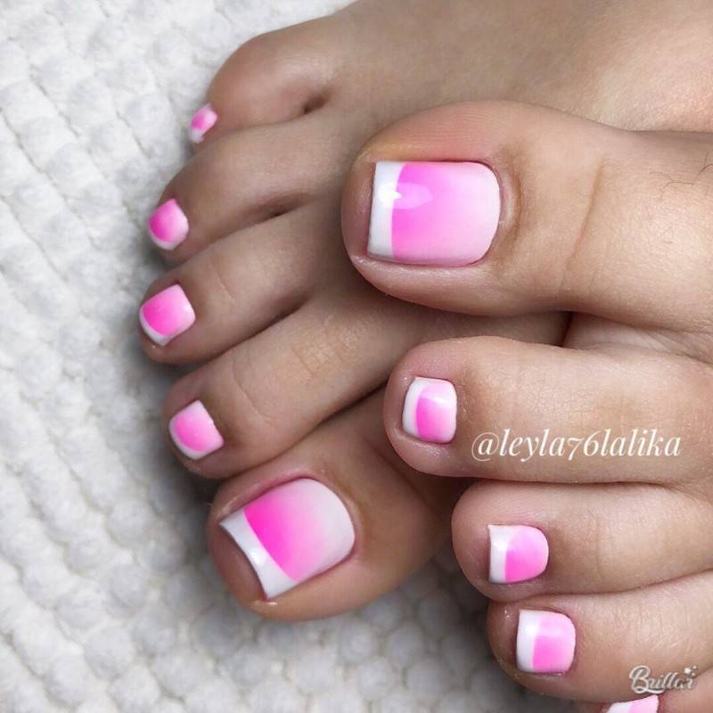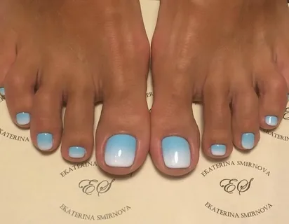 - градиент – аккуратно и нежно выглядит педикюр в светлых оттенках с градиентным переходом, можно менять насыщенность цвета от кончика к кутикуле или оттенок, например, от голубого к розовому или от бежевого к белому;